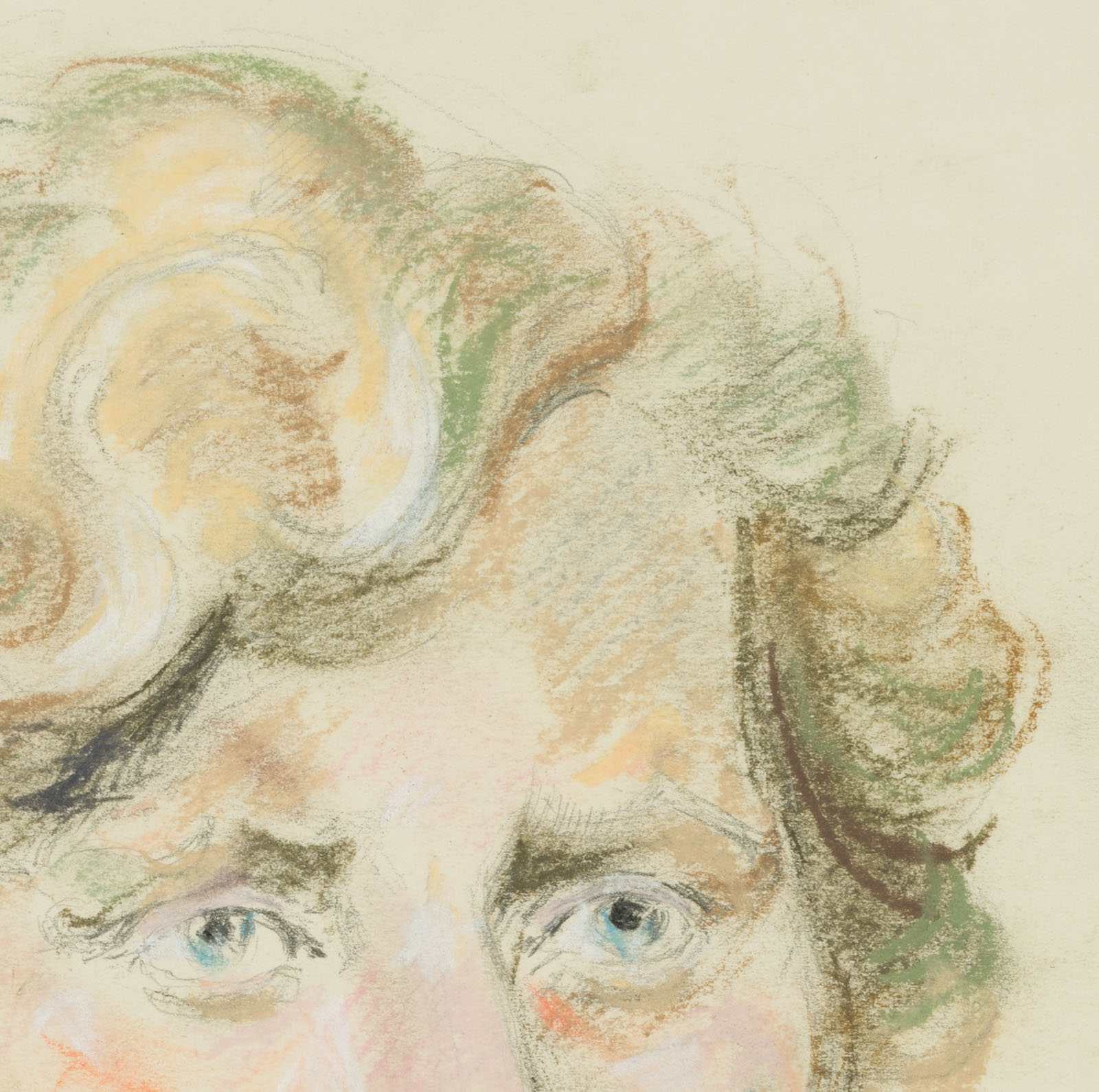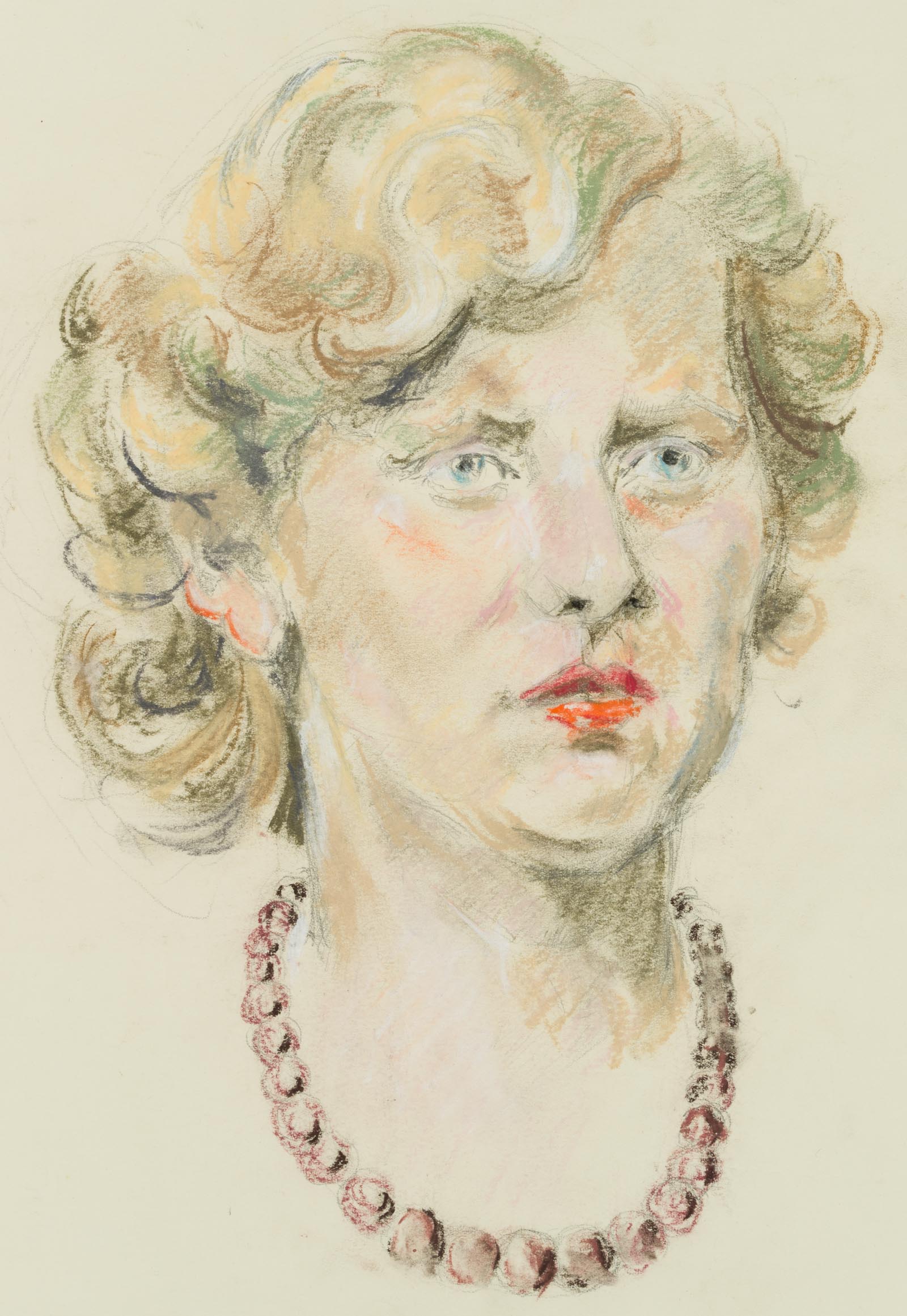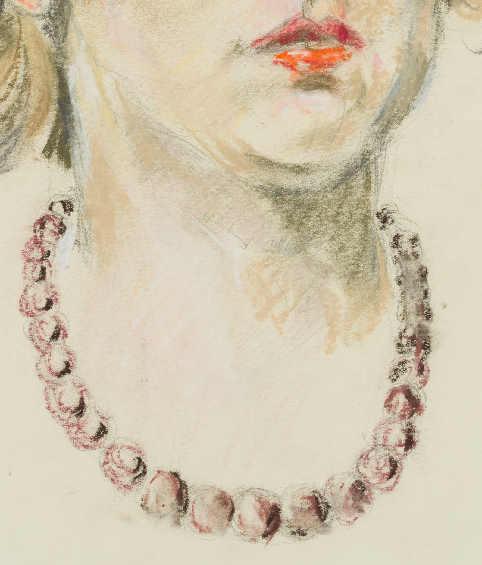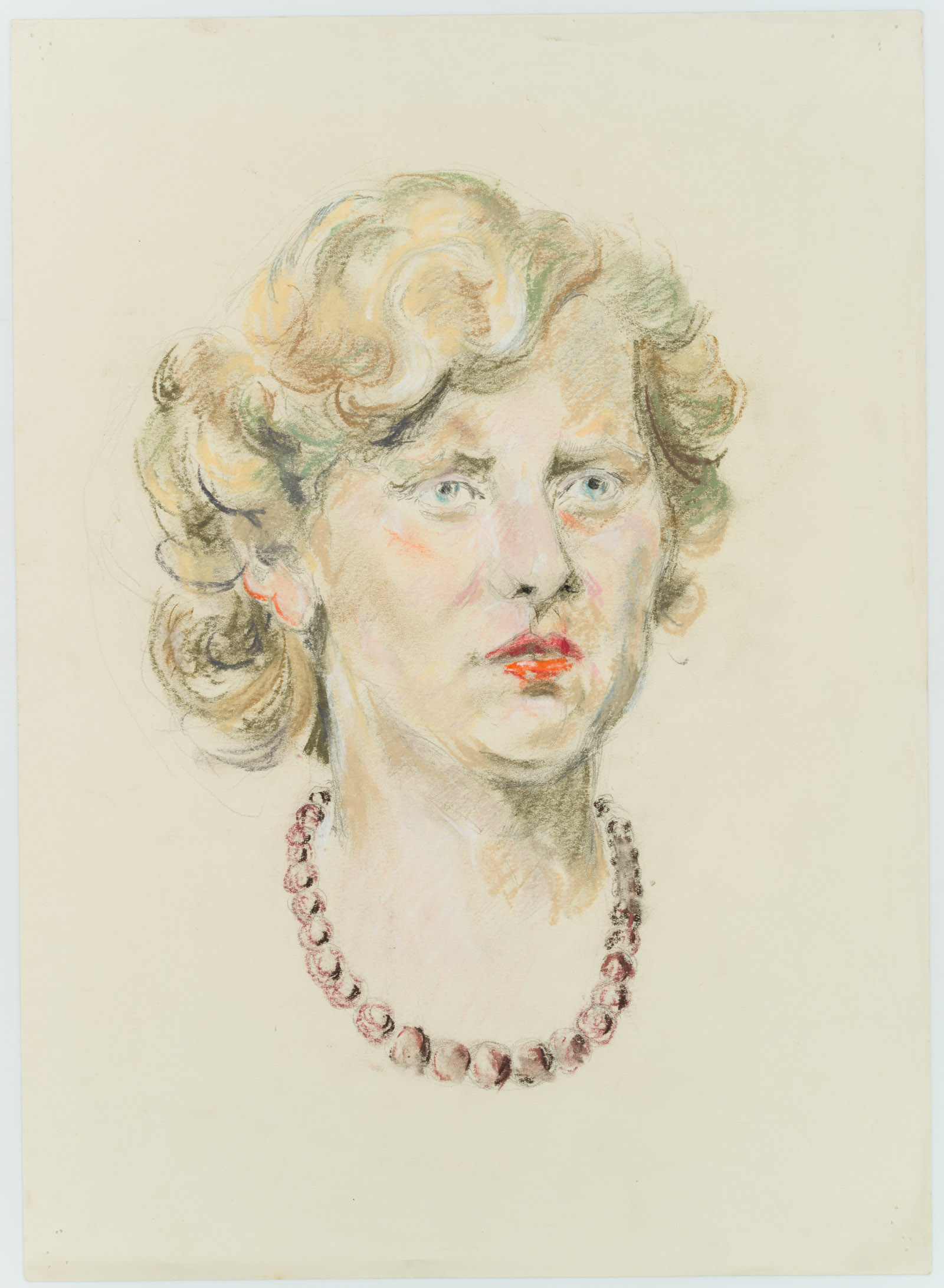 - Description: Without inscription. Portrait of a young woman in 3/4 profile. She wears her short hair curly, her lips are coloured red. Around her neck she wears a dark pearl necklace, her gaze goes, past the viewers, out of the picture space.