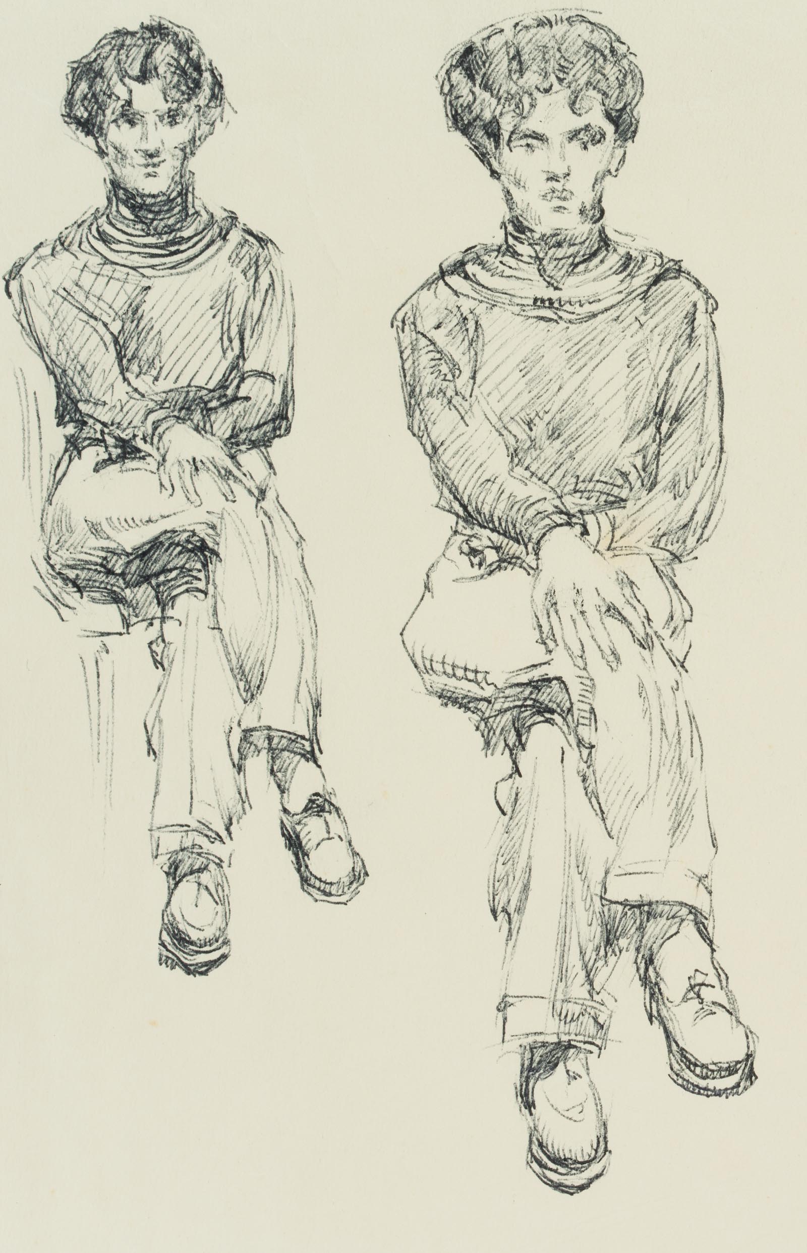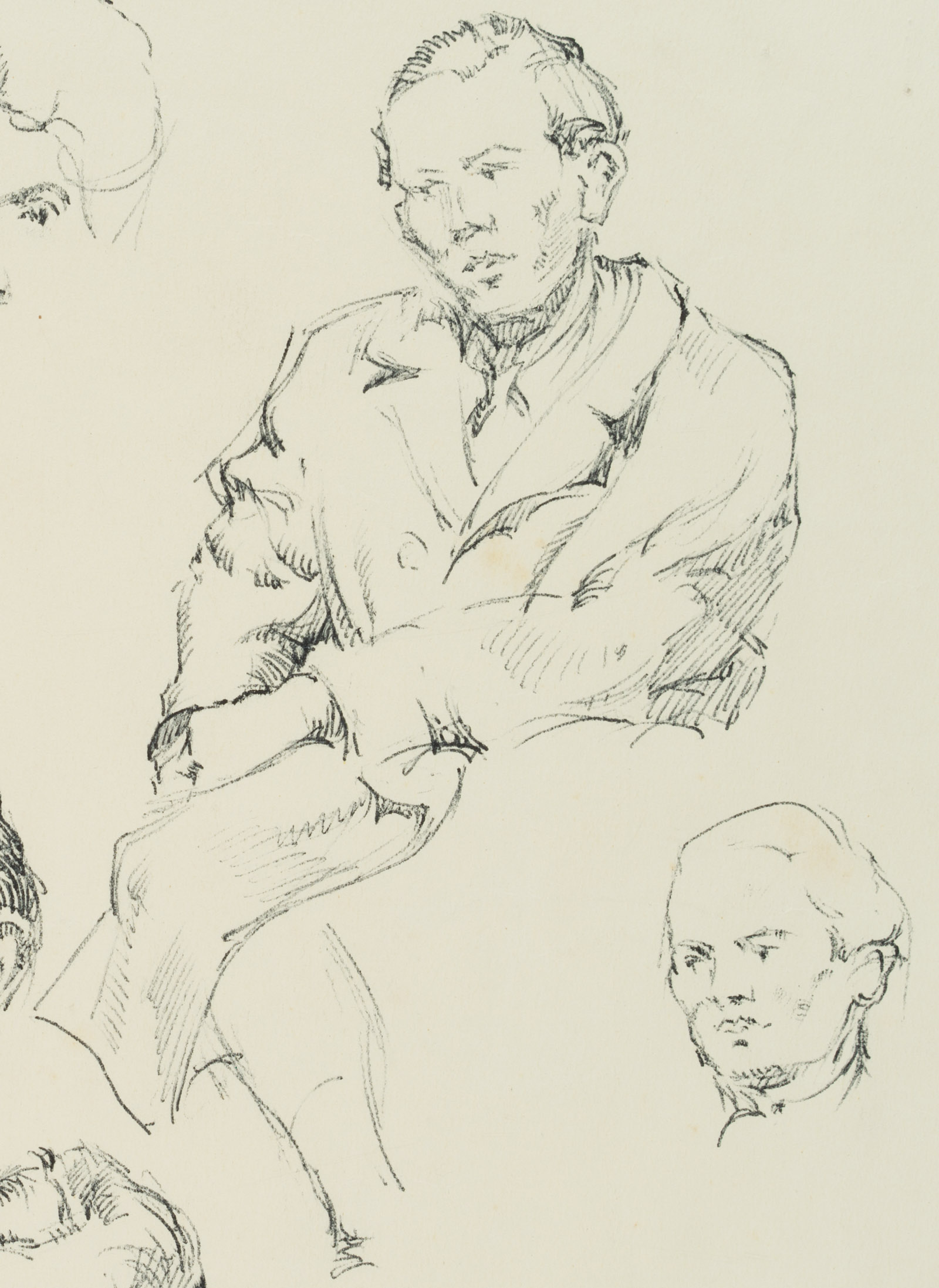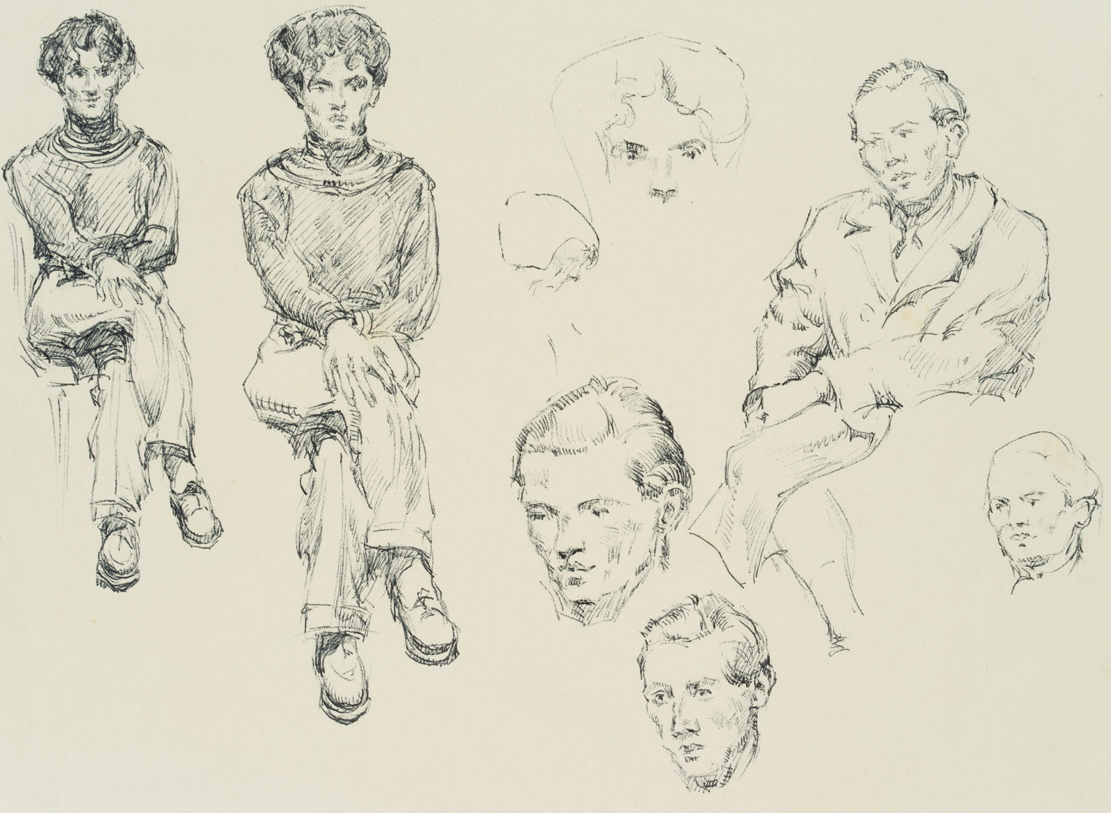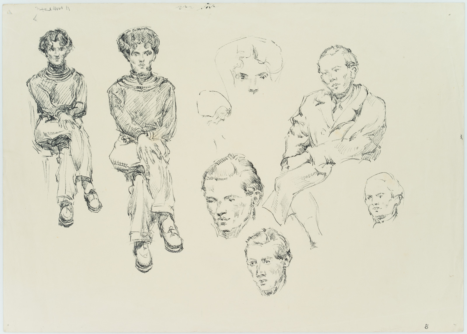 Ohne Bezeichnung. Sieben Porträtstudien, darunter zwei Darstellungen einer sitzenden Frau mit kurzem Haar. Daneben ein Detail ihrer Augenpartie und das Profil. Porträtskizze eines sitzenden Mannes, umgeben von drei Kopfstudien. Mit schnellem, bestimmtem Duktus formulierte der Künstler eine Momentaufnahme der Porträtierten.