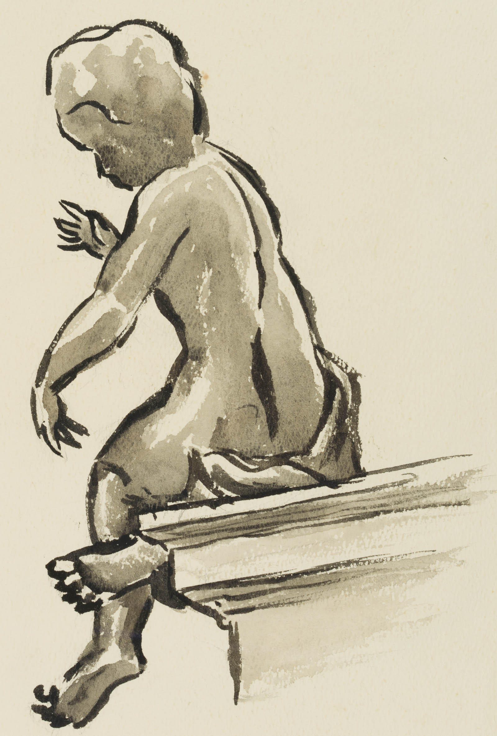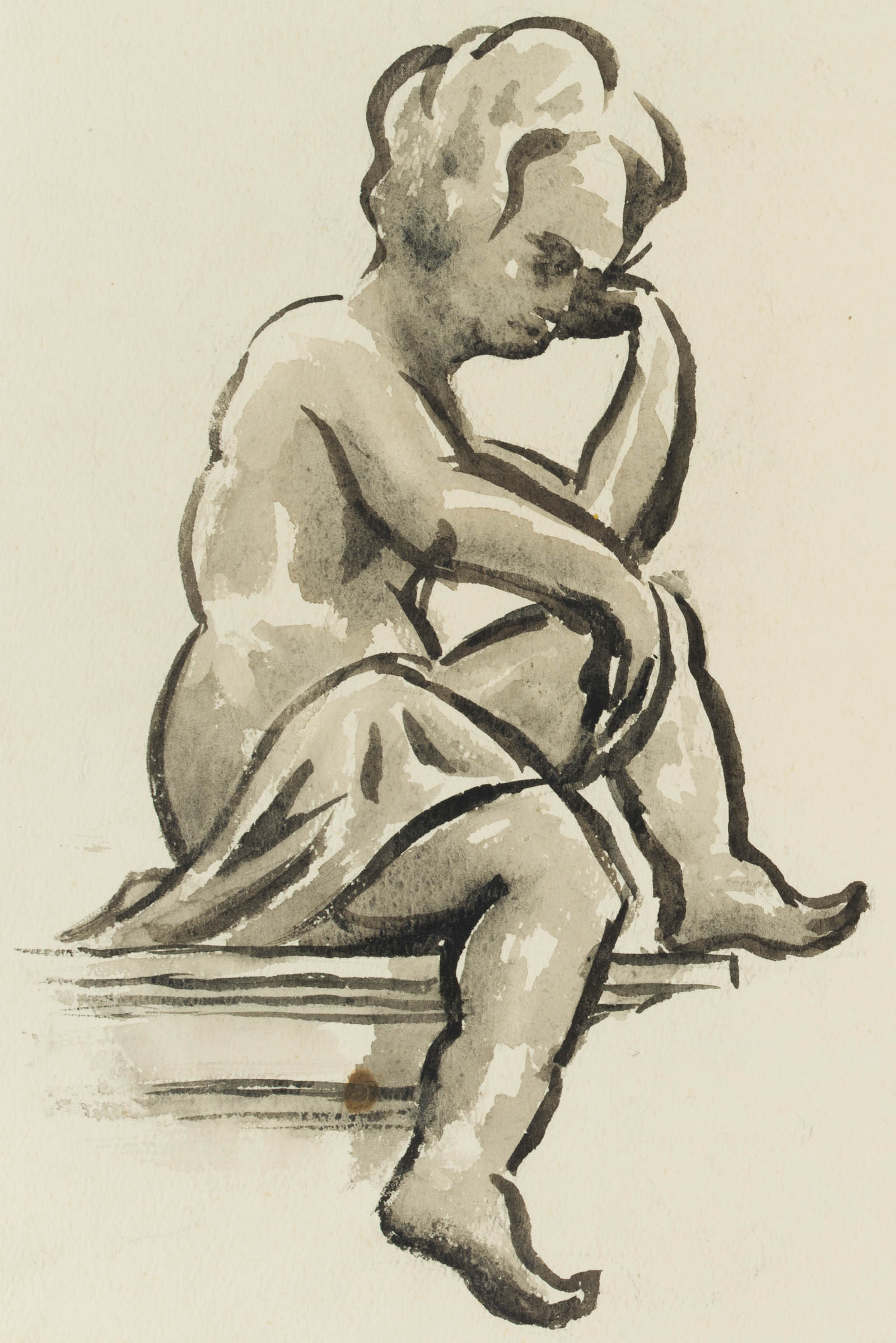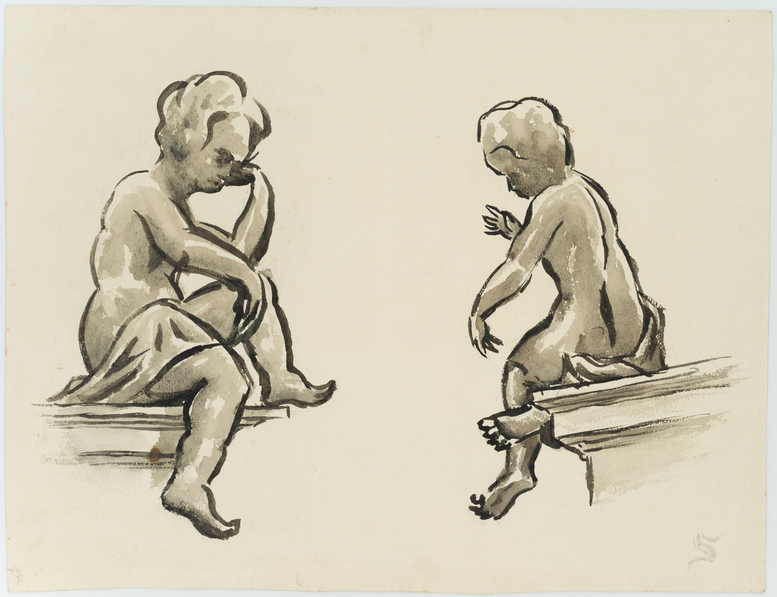 - Beschreibung: monogrammiert unten rechts “S”. Darstellung zweier Engelsfiguren aus unterschiedlichen Perspektiven. Wärhend die eine Figur ihren Kopf in die linke Hand gestützt zu haben scheint, gestikuliert die andere mit einer ausladenden Geste. Die Figuren dienten wohl als schmückendes Element auf einem Gesims oder Gebälk.