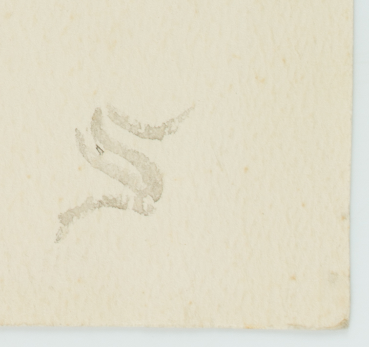 - Condition: Good condition. Isolated faint discolourations, the corners are bumped and partly show crease marks. Vertical crease in the centre. On the reverse a pencil sketch of a girl in profile.