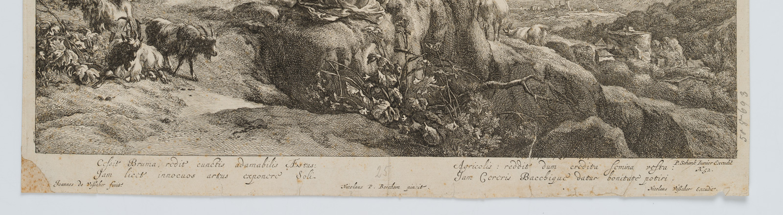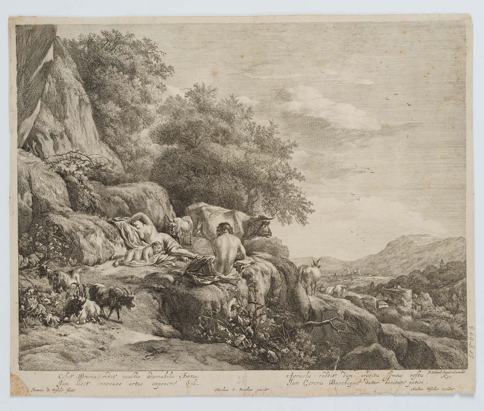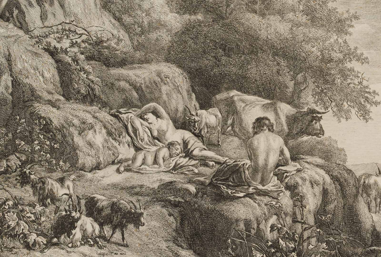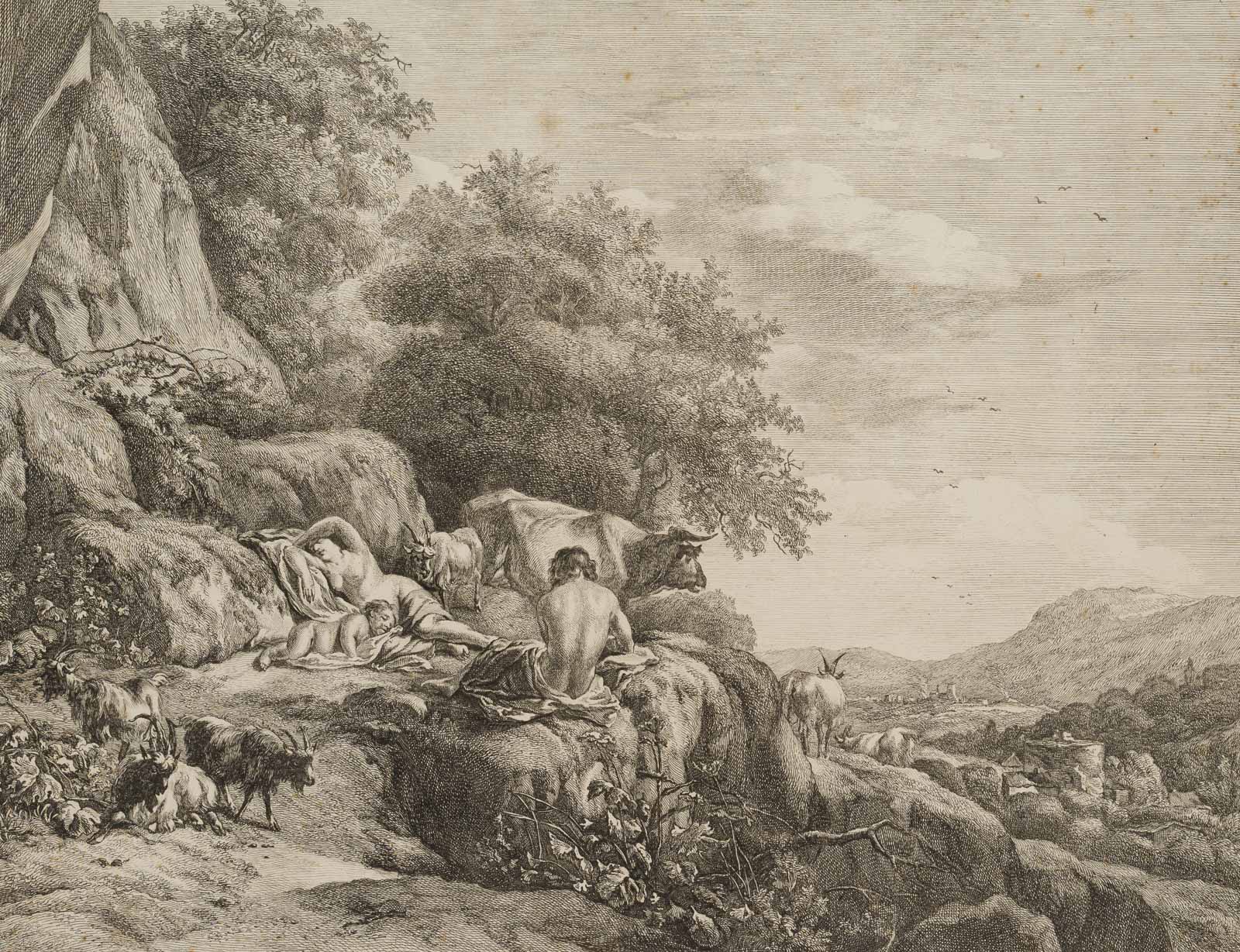 Pieter Schenk (1660 Elberfeld – 1718 Amsterdam) after Nicolaes Berchem (1620 Haarlem – 1683 Amsterdam), Bucolic scene with a resting shepherd family lying down unclothed on a projecting rock together with goats and cattle, , Copper engraving
