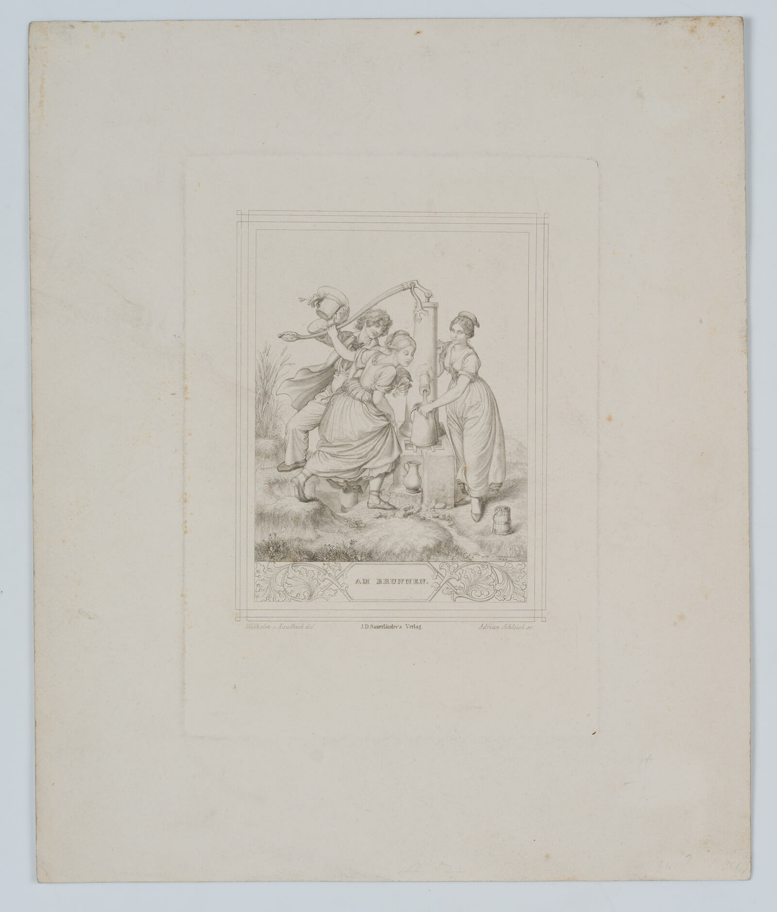 - Beschreibung: Wilhelm von Kaulbach (geboren 1805 in Arolsen gestorben 1874 in München) “Am Brunnen”, 19. Jahrhundert, Stahlstich, Stecher: Adrian Schleich (geboren 1812 in München gestorben 1894 ebenda). Signiert unten links ” Wilhelm verso. Kaulbach”, rechts mit “Adrian Schleich” und mittig mit ” J.D. Sauerländer”. Die mit “Am Brunnen” betitelte Szene zeigt zwei junge Frauen und einen jungen Mann am Brunnen. Während der Mann mit einer schwungvollen Geste den Pumphebel bedient, fängt die rechte Frau das fließende Wasser mit einem Krug auf. Die zweite Dame hat ihre Röcke gelupft und blickt interressiert auf den Wasserstrahl.