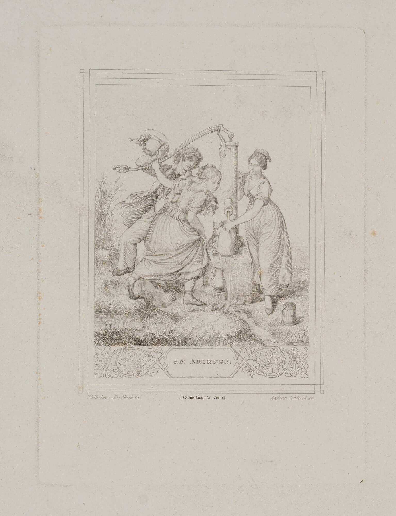 - Description: Wilhelm von Kaulbach (born 1805 in Arolsen died 1874 in Munich) “Am Brunnen”, 19th century, steel engraving, engraver: Adrian Schleich (born 1812 in Munich died 1894 there). Signed lower left ” Wilhelm verso. Kaulbach”, on the right with “Adrian Schleich” and in the centre with ” J.D. Sauerländer”. The scene titled “Am Brunnen” shows two young women and a young man at the fountain. While the man operates the pump lever with a sweeping gesture, the woman on the right catches the flowing water with a pitcher. The second lady has lifted her skirts and is gazing with interest at the stream of water.