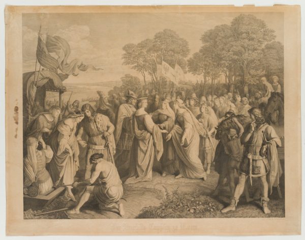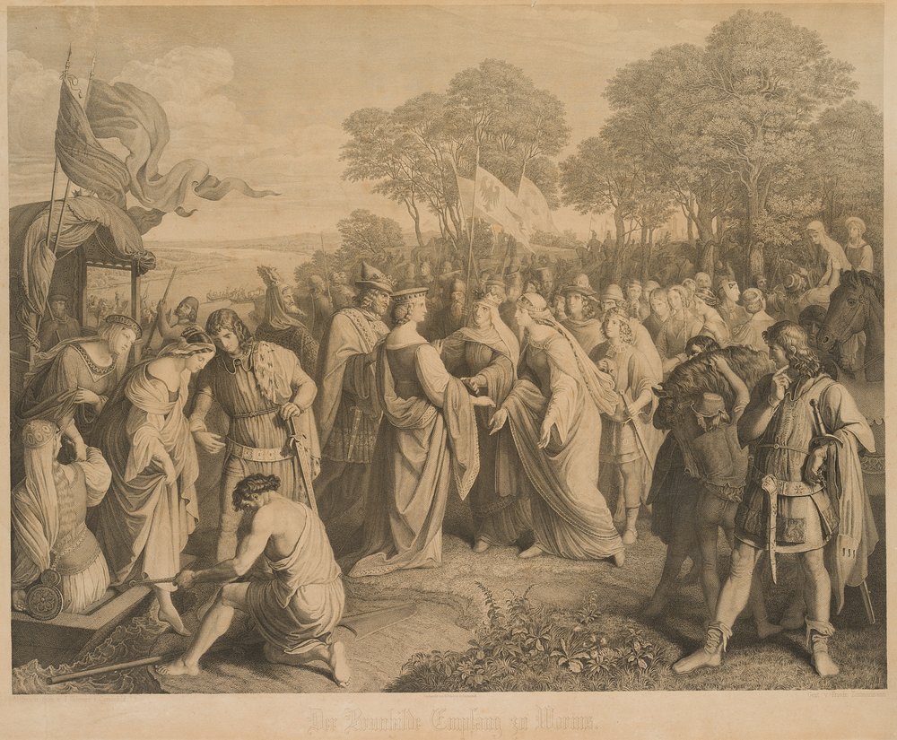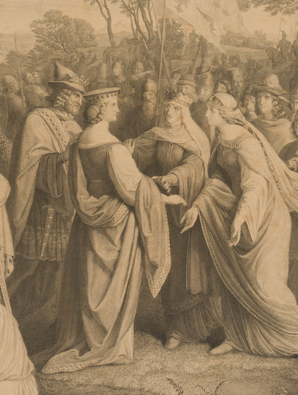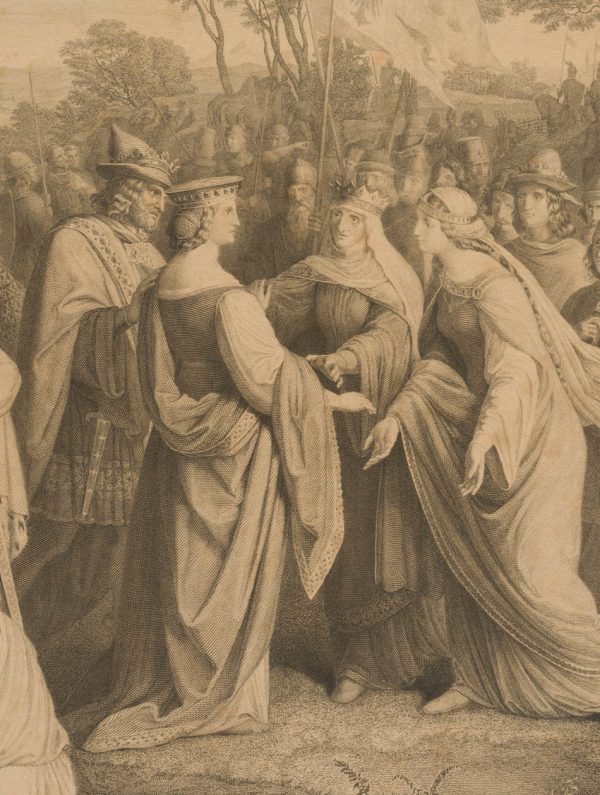 Julius Schnorr von Carolsfeld (1794 Leipzig – 1872 Dresden) nach Friedrich Wilhelm Zimmermann (1826 Gornewitz – 1887 München), Der Brunhilde Empfang zu Worms, Szene aus der Nibelungensage, 1862, Kupferstich