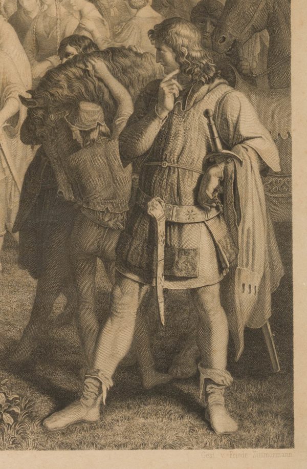 - Bezeichnung: Unterhalb der Darstellung in der Druckplatte signiert und bezeichnet: “Al fresco gem. v. J. Schnorr v. Carolsfeld”, “Gedruckt von H. Felsing in Darmstadt”, “Gest. v. Friedr. Zimmermann” und “Der Brunhilde Empfang zu Worms”