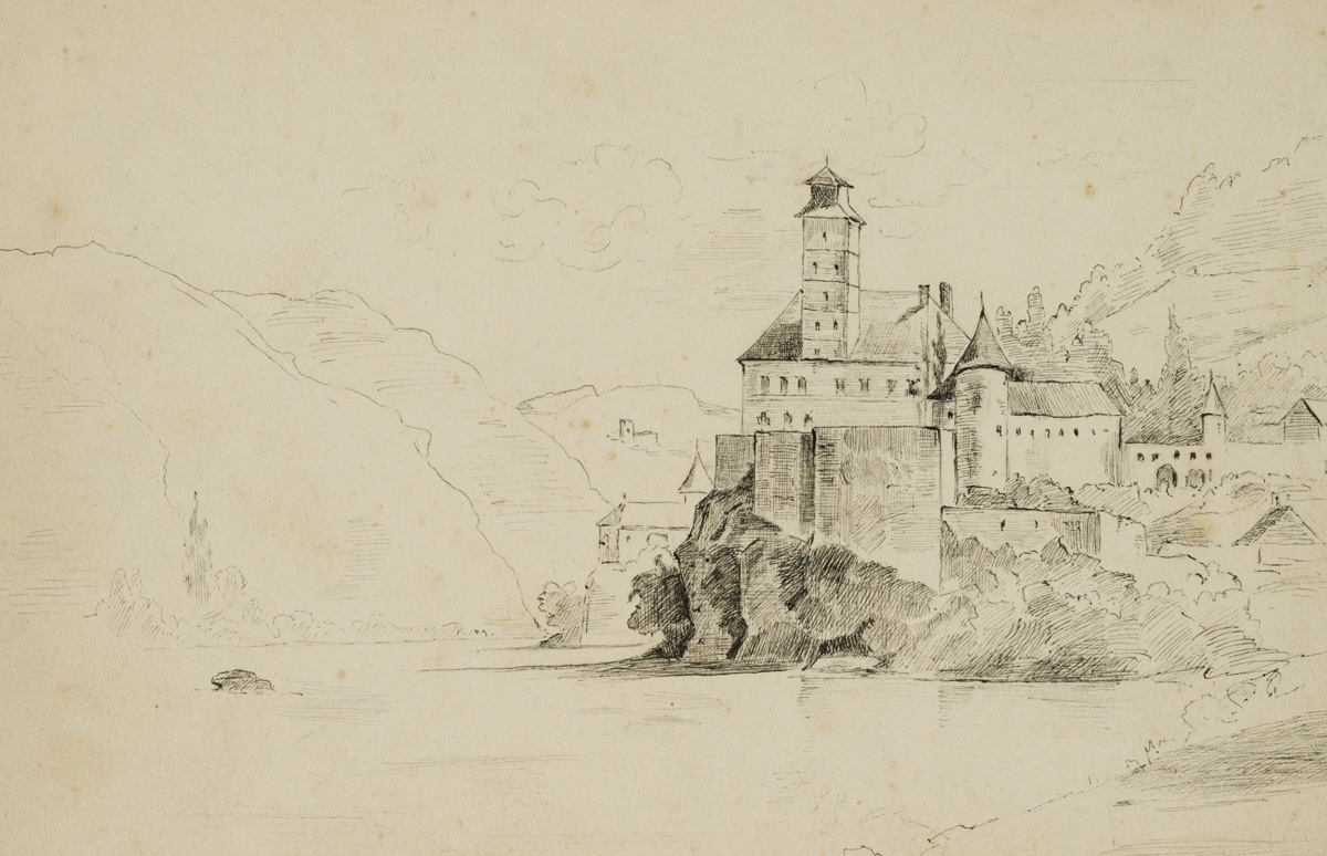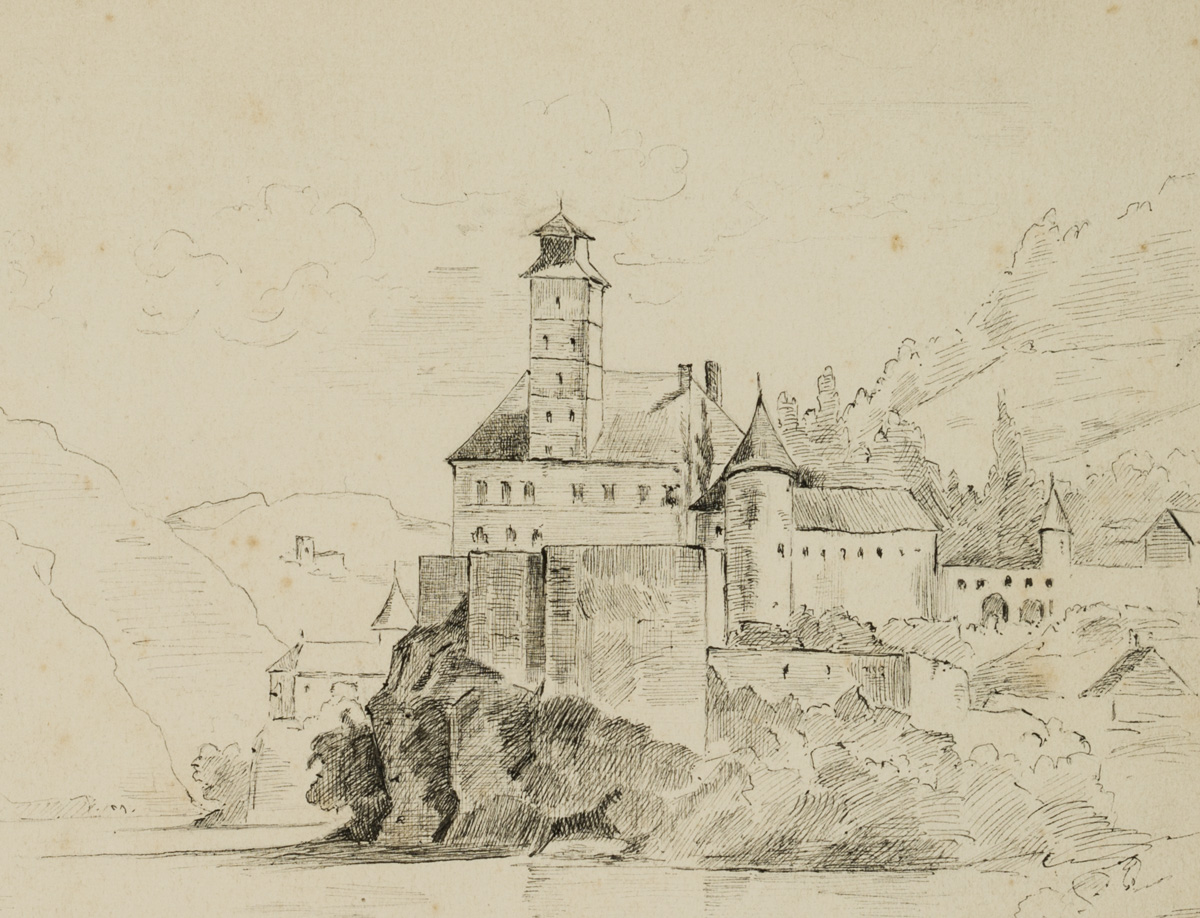 Schönbüchl (19. Jahrhundert), Blick auf eine Festung am Wasser, 19. Jahrhundert, Tusche