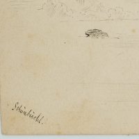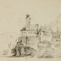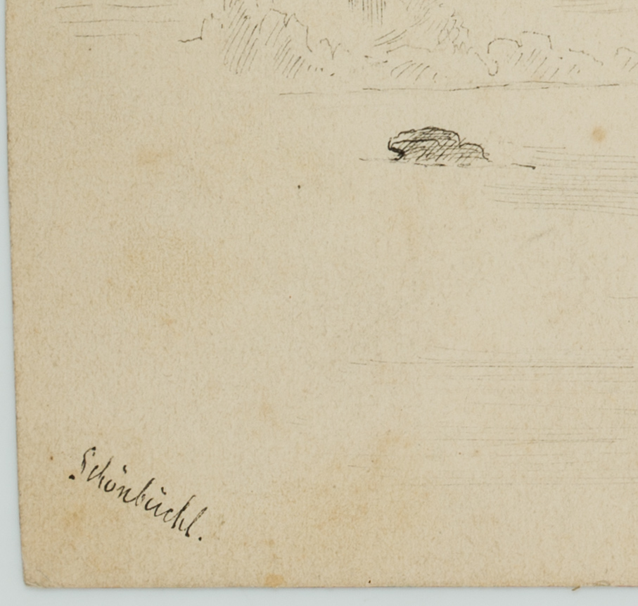- Description: inscribed on the lower left “Schönbüchl”. On the bank of a body of water, a massive rock rises on the right, on whose crest and slopes a castle complex can be seen. In the background another fortress, on the horizon a ruined castle.