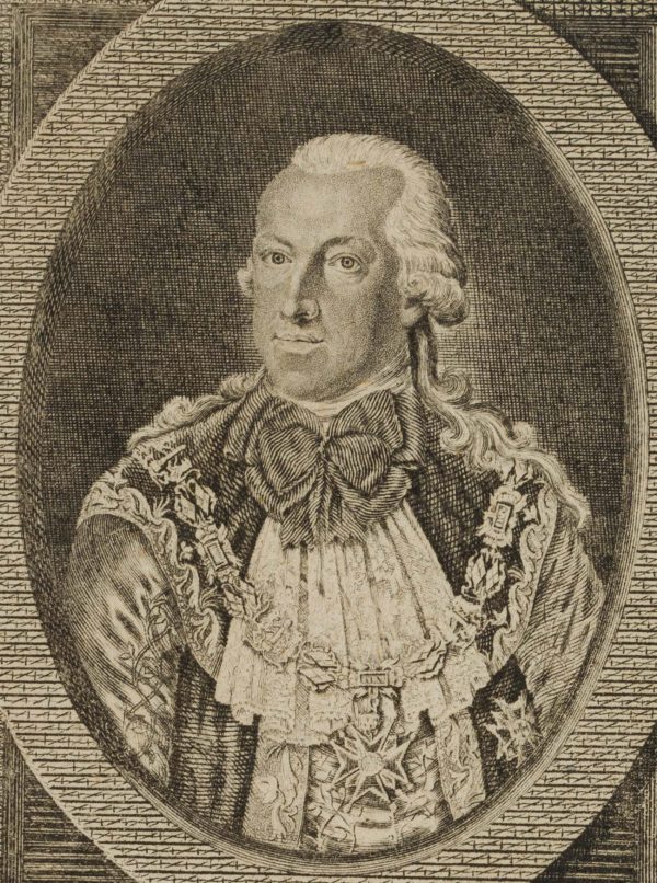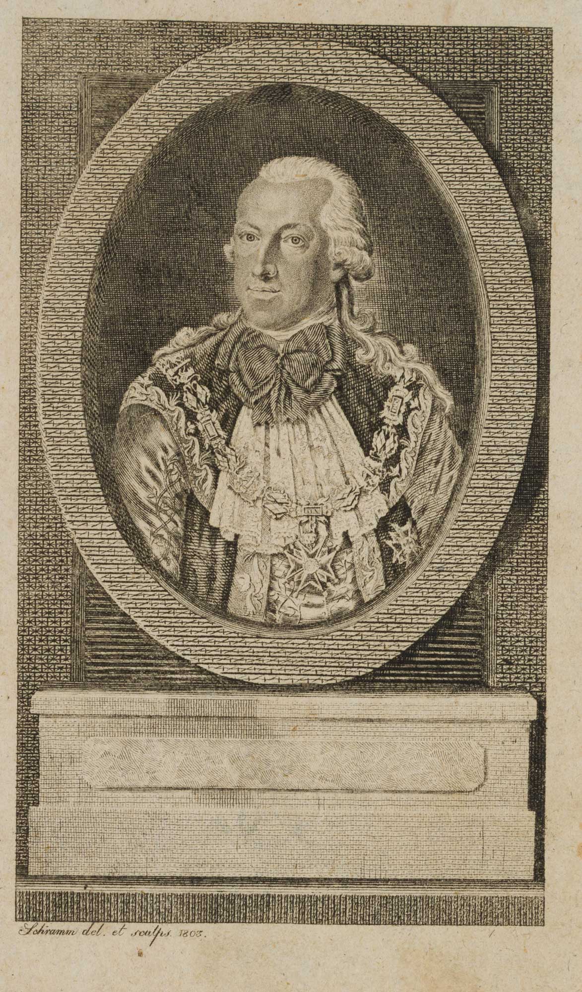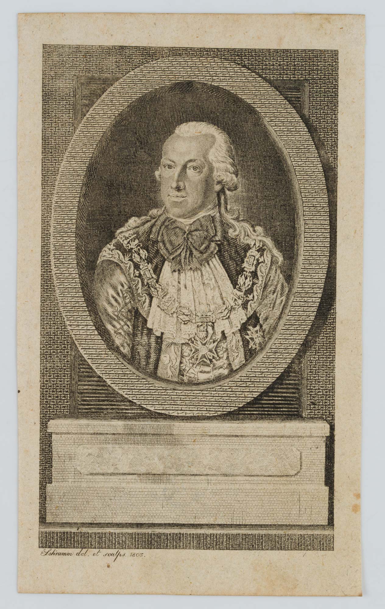 Schramm (19. Jahrhundert), Porträt des Joseph August Graf von Toerring (1753 München – 1826), Bayerischer Politiker und Dramatiker sowie Gutsherr der ehemaligen Reichsabtei Gutenzell (Zisterzienserinnen) zu Gutenzell, Baden-Württemberg, ovales Brustporträt nach links auf Sockel, 1803, Kupferstich