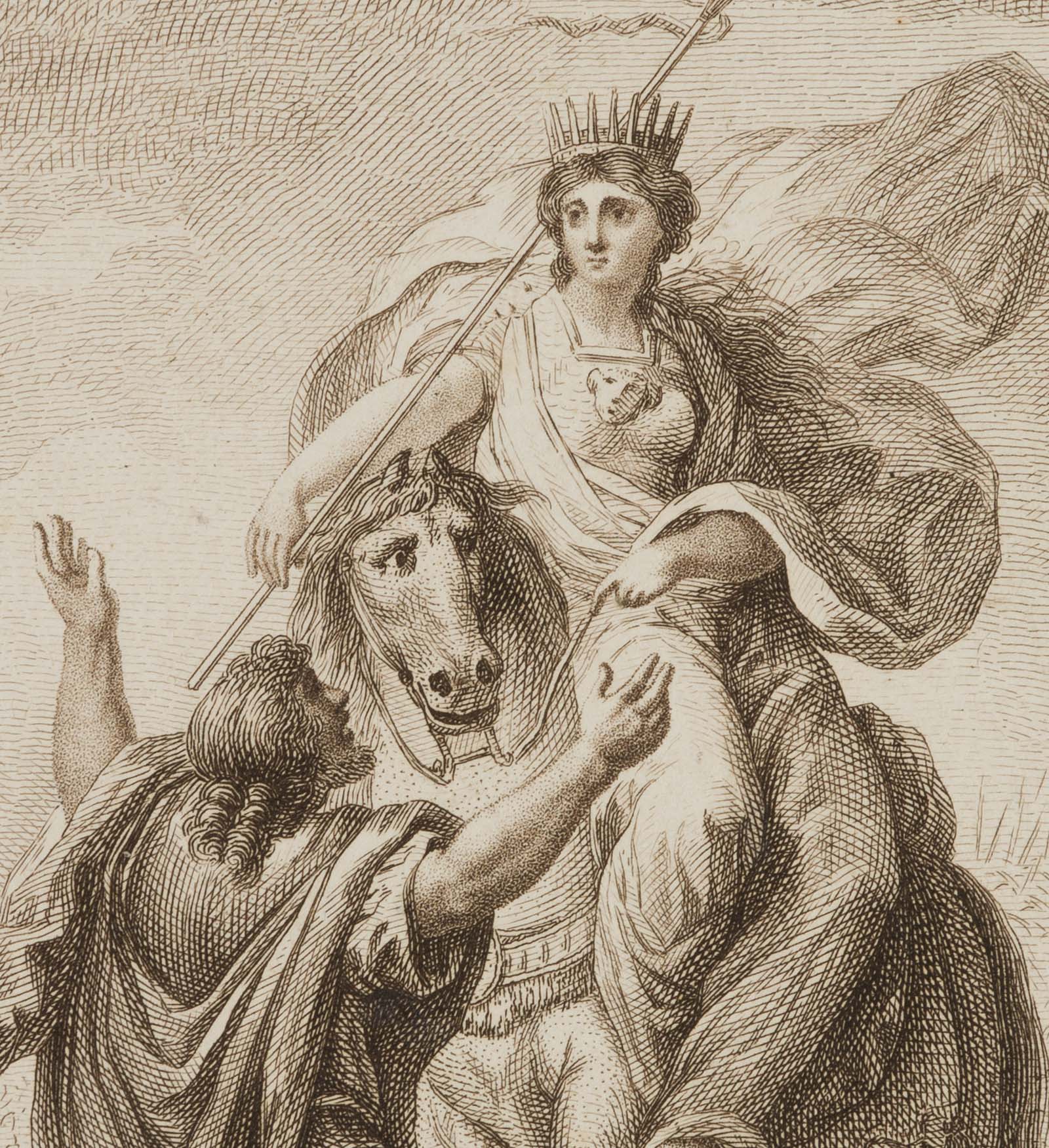 Johann Friedrich Schreyer (1768 Dresden – 1795 ebd.) nach Johann Eleazar Schenau (1737 Großschönau – 1806 Dresden), Herrscherin zu Pferde, 18. Jahrhundert, Radierung