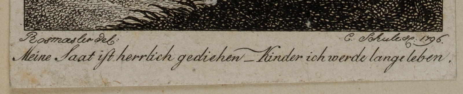 - Description: Miniature and illustration of contemporary literature. Signed and dated in the plate below: “Rosmaesler del / C. SChule sc. 1796.”.Johann Adolf Rosmäsler (1770 Leipzig – 1821 Leipzig). German engraver and etching artist, brother of Johann August Rossmäßler. Produced numerous portrait engravings in stipple style. Published the “Gründliche Anweisung zeichnen zu lernen” with a series of 24 sheets after Adam Friedrich Oeser (Leipzig: Carl Cnobloch 1812, 2nd edition 1832).The print comes from the collection of the Munich architect Fritz Hasselmann (1867-1925), with blue collector’s mark “F.H.” on the verso, Lugt number L.1012. From the famous house “Ludwig Rosenthal’s Antiquariat”, Munich.