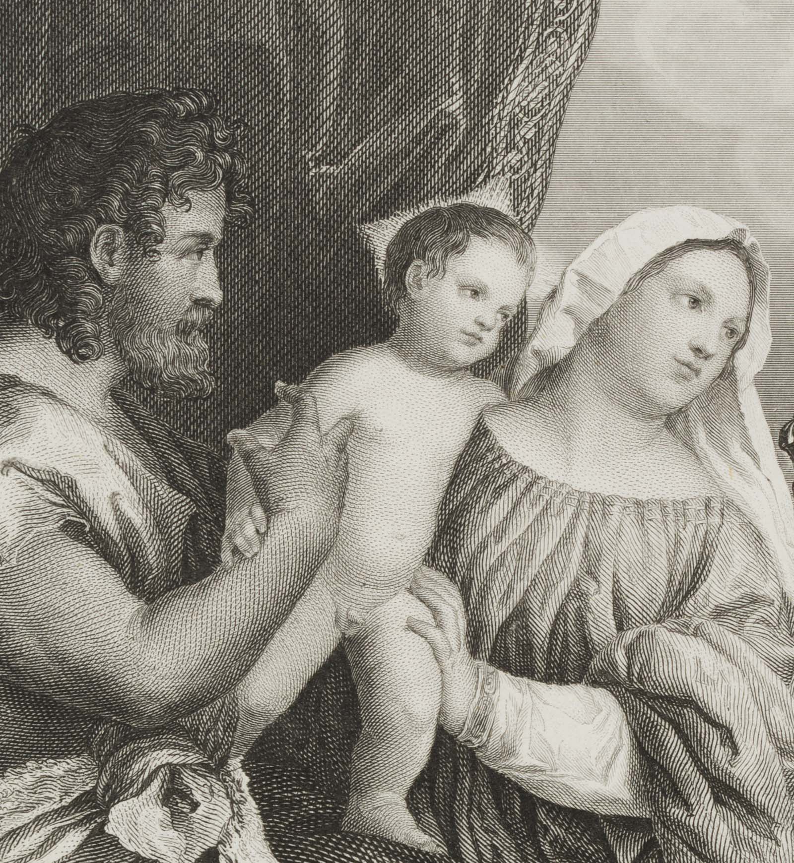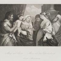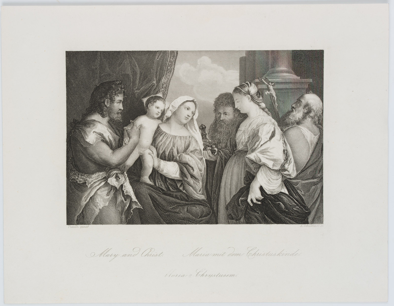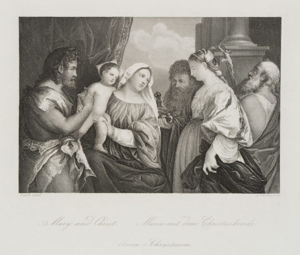Albrecht Fürchtegott Schultheiß (1823 Nürnberg – 1909 München) nach Tizian: Tiziano Vecellio (um 1488 Belluno – 1576 Venedig), Maria mit dem Christuskind und vier Heiligen, um 1846, Stahlstich