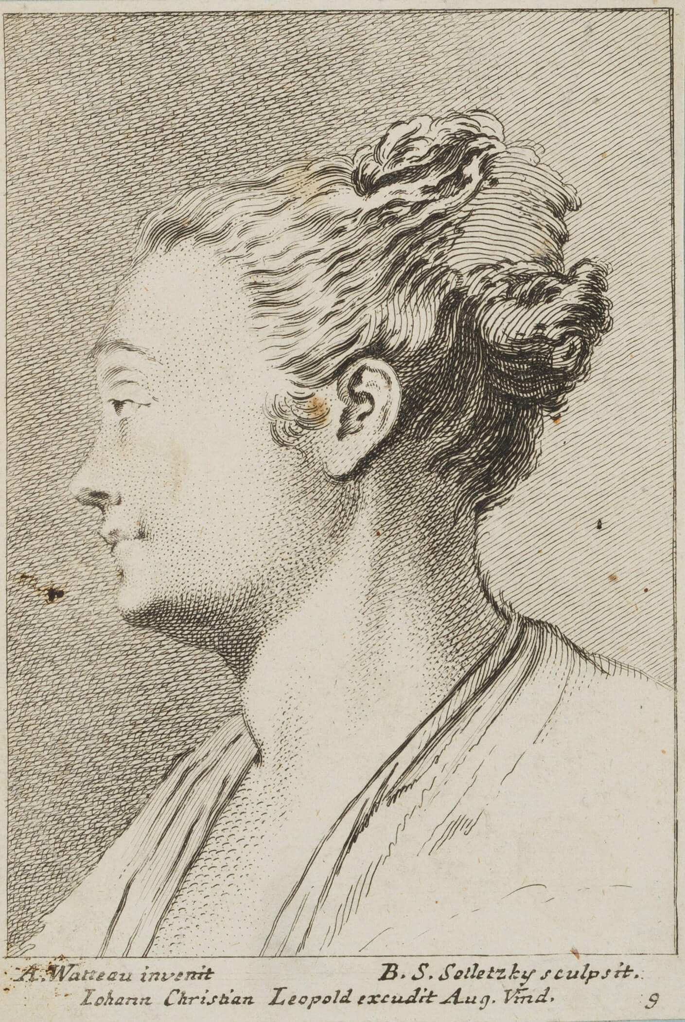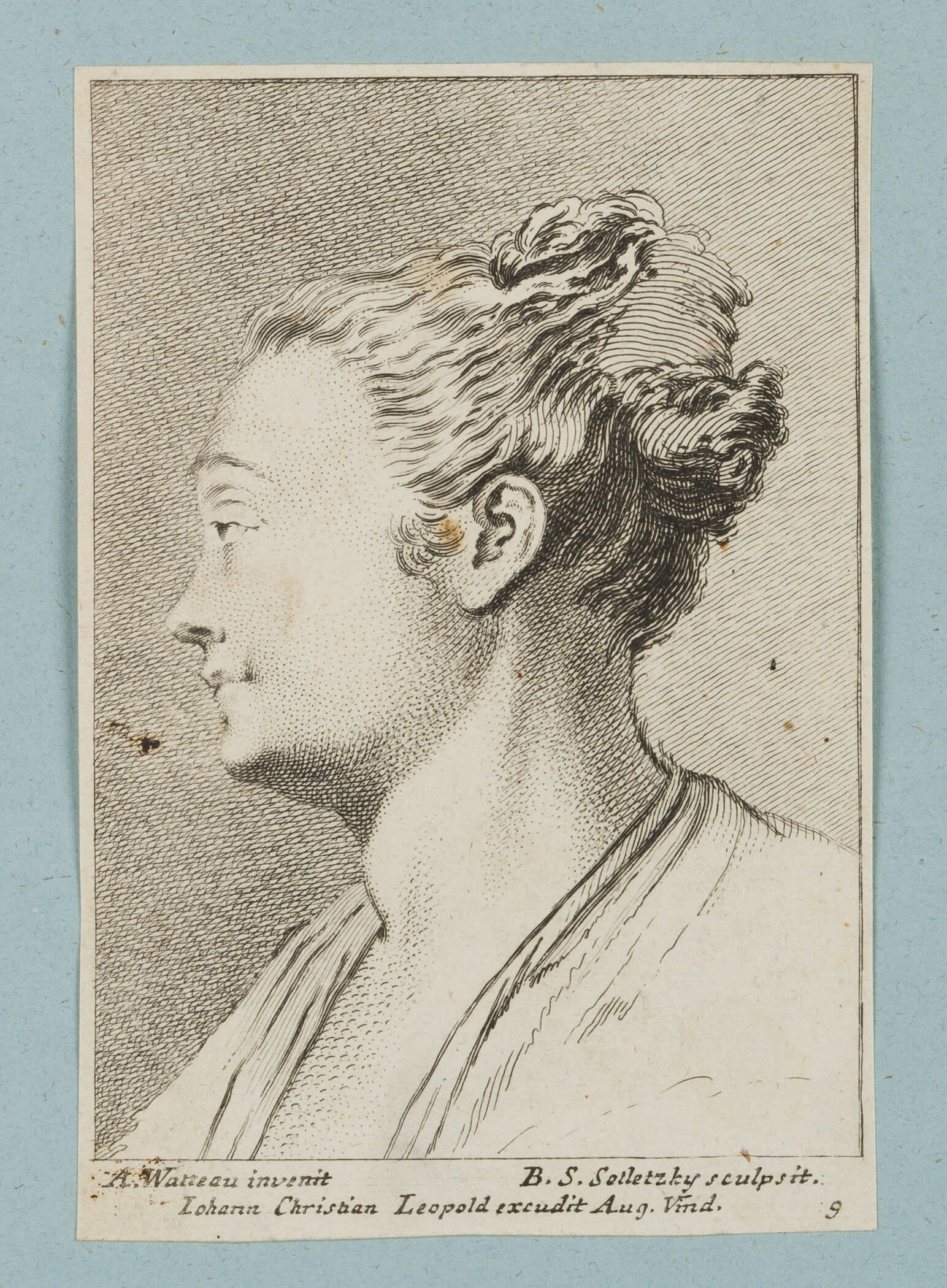 Balthasar Sigmund Setletzky (1695 Augsburg – 1771 ebd.) nach Antoine Watteau (1684 Valenciennes – 1721 Nogent-sur-Marne), Kopfstudie einer Frau, 18. Jahrhundert, Radierung