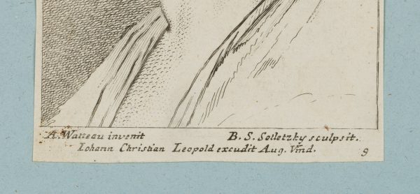 - Bezeichnung: Unterhalb der Darstellung links und rechts signiert, darunter der Name des Herausgebers, Johann Christian Leopold. Daneben nummeriert mit “9”.
