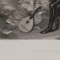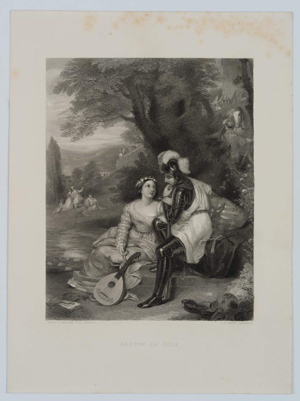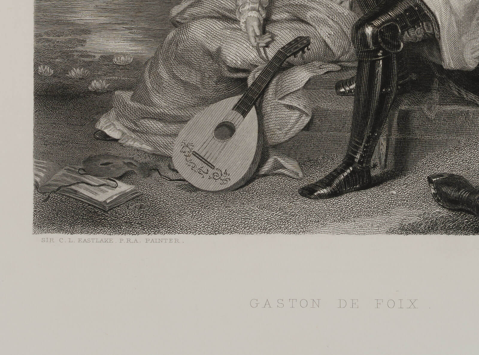 - Description: Charles Lock Eastlake the Elder (1793-1865), painter, William Sharpe (1749-1824), engraver, Gaston de Foix, steel engraving, c. 1860, published by H. Mandeville Paris, showing the Duke of Nemours Gaston de Foix in knight’s armour in front of a young woman with a lute on the river bank.