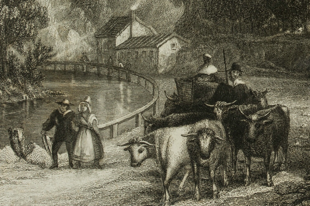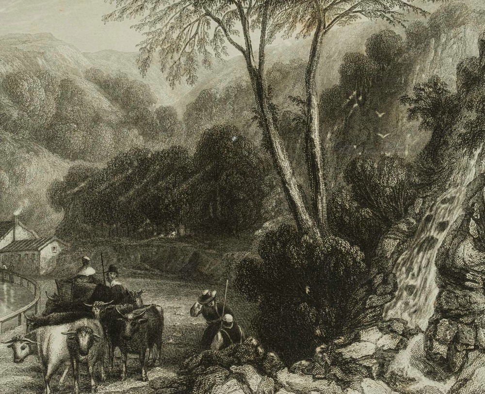 Landschaftsdarstellung am Fluss bei Theux, in der Provinz Lüttich. Im Vordergrund der Darstellung sind Figuren zu erkennen, darunter ein Ochsengespann, sowie männliche Figuren bei der Rast am Wegesrand. Die Figurengruppe im Vordergrund gibt den Blick frei auf den Ausblick in die Landschaft, die durch bewaldete Hügel und Felsen dominiert wird. - Schlagworte: Landschaft, Deutschland, Romantik, 1800-1849