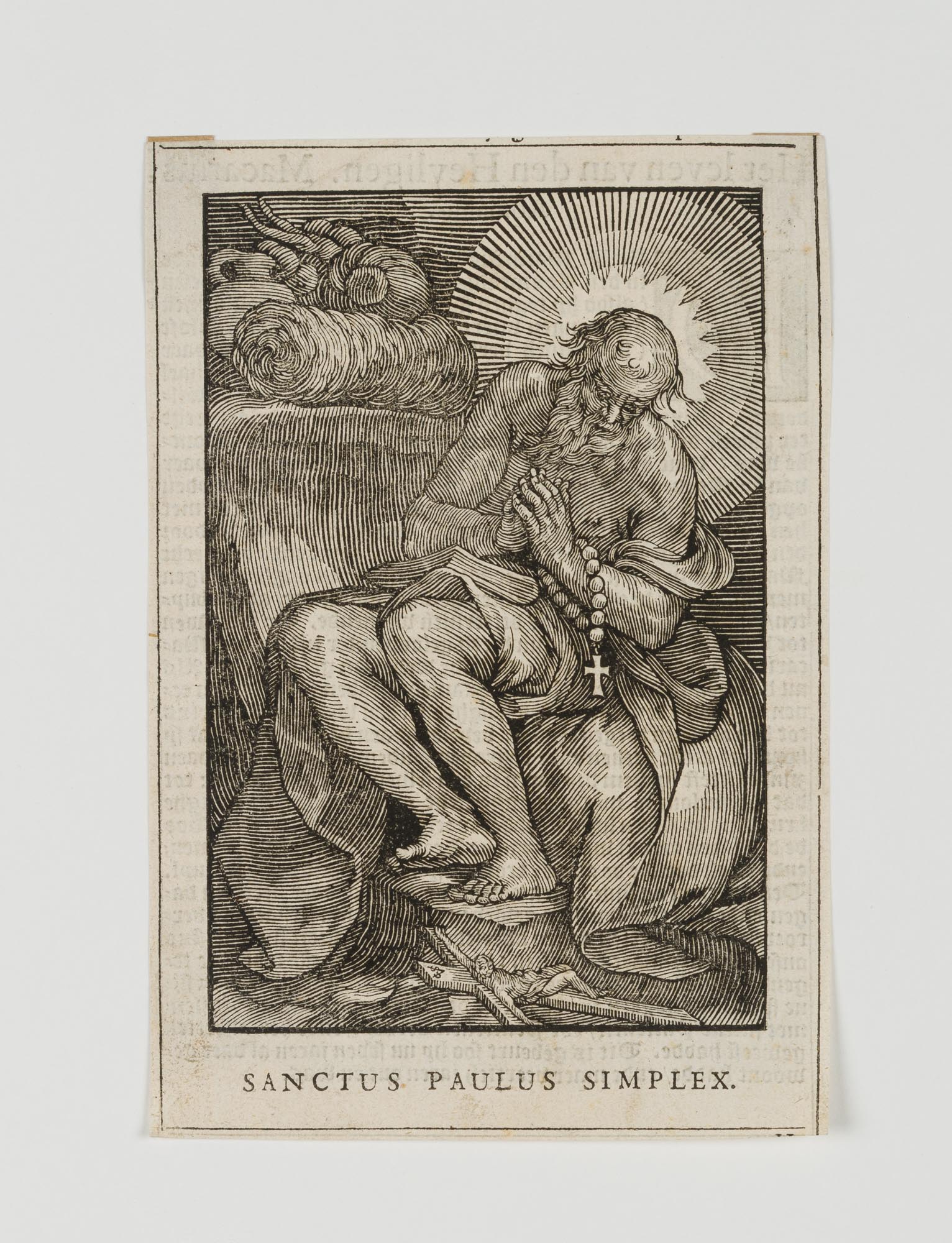 - Description: Depicted is Paul of Thebes (* allegedly 228; † allegedly 341), Christian saint and, according to legend, first Egyptian hermit and desert father, therefore also called Saint Paul the First Hermit. Titled “Sanctus Paulus Simplex” under the depiction, on the cross with monogram: CvS. Inscribed on the backing by another hand with information on Ch.v. Sichem: “Th-B vol. XXX, p. 585. ..Perhaps from Jan van Gorcum ‘t. Bosch der eremyten ende eremitinnen” Amsterdan 1644, (that is 50 depictions of saints)”.