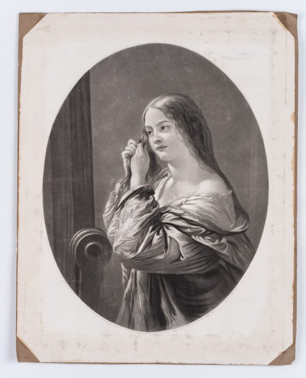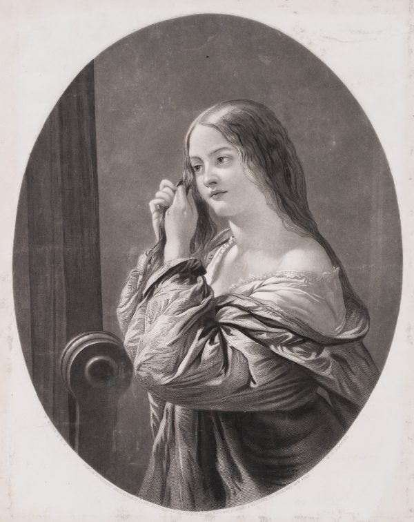 William Henry Simmons (1811 London – 1882 ebd.) nach Frank Stone (1800 Manchester – 1859 London), Junge Frau bei der Morgentoilette beim Flechten der Haare, 1854, Mezzotinto