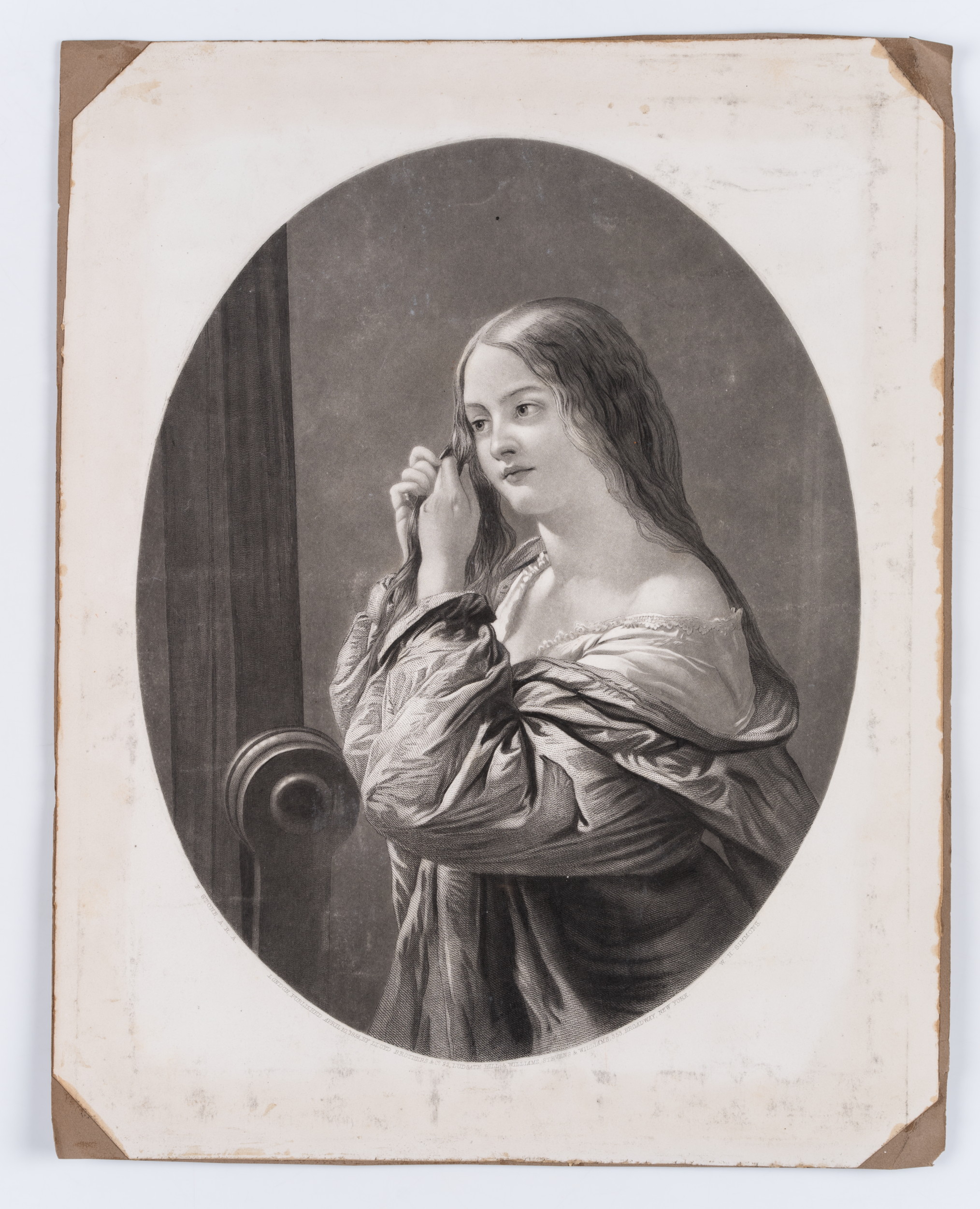 William Henry Simmons (1811 – 1882 ) after Frank Stone (1800 – 1859 ), Young woman braiding her hair during morning toilette, 1854, Mezzotint