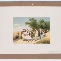 - Description: Delightful depiction of a young woman with a luxuriantly draped dressing gown. Another print is mounted on the verso of the same support. It shows a reproduction of a painting with traditional costume figures by Jakob Fürchtegott Dielmann.