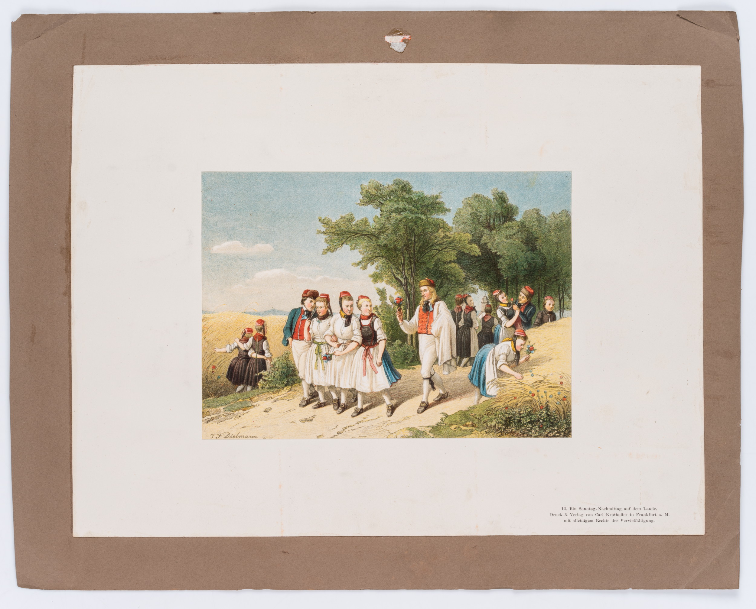 - Beschreibung: Entzückende Darstellung einer jungen Frau mit üppig draperiertem Morgenrock. Auf der selben Unterlage ist verso eine weitere Druckgrafik aufgezogen. Sie zeigt eine Reproduktion eines Gemäldes mit Trachtenfiguren von Jakob Fürchtegott Dielmann.