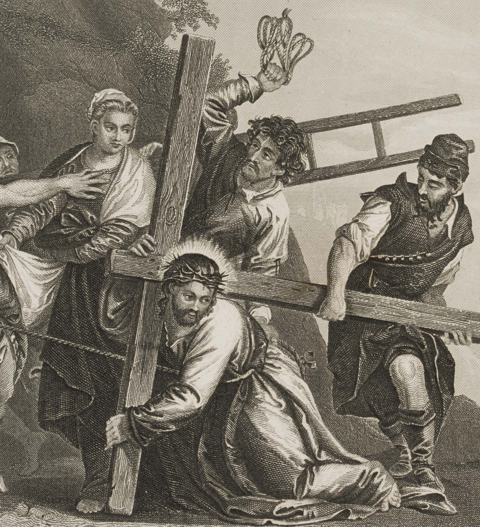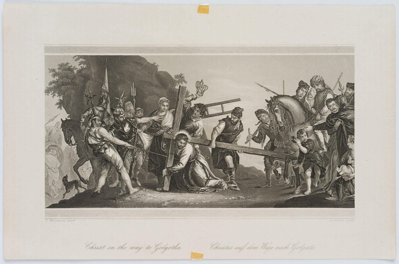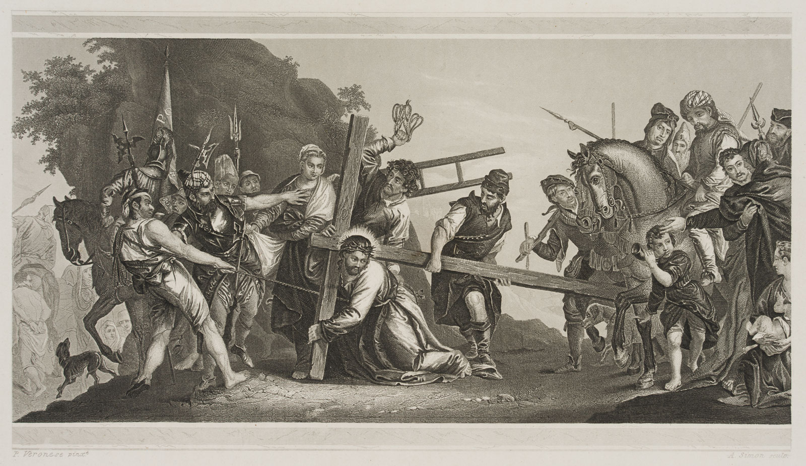 - Description: Scenario rich in figures. The Messiah collapsed under the weight of the cross, dragged forward by a henchman, while one of his own helpfully lifts the cross. Signed below the depiction “P. Veronese pinxt. / A. Simon sculp.”, titled in two languages below; inscribed by hand on the verso “A. Simon c. 1820 L Seeri Berlin -450-.