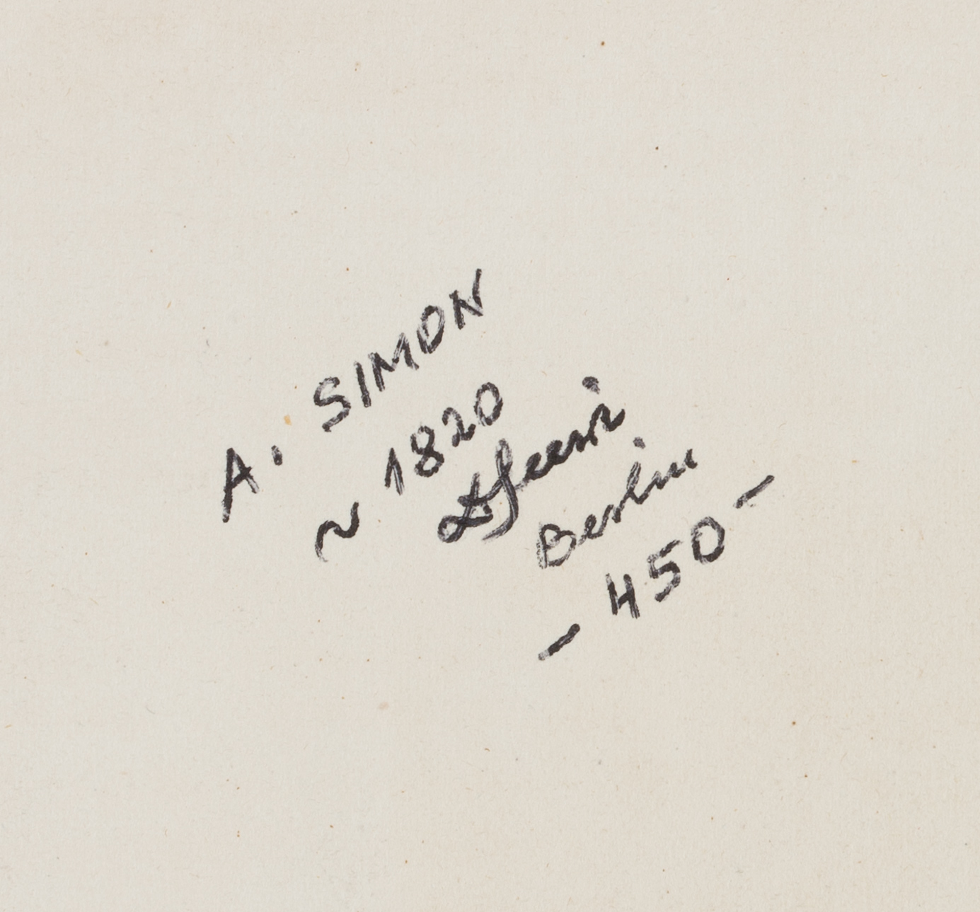 - Beschreibung: Figurenreiches Szenarium. Der unter der Last des Kreuzes zusammengebrochene Messias, vorwärtsgezerrt von einem Schergen, während einer der Seinen hilfreich das Kreuz anhebt. Unter der Darstellung signiert “P. Veronese pinxt. / A. Simon sculp.”, darunter zweisprachig betitelt; verso handschriftlich bezeichnet “A. Simon c. 1820 L Seeri Berlin -450-.
