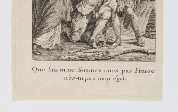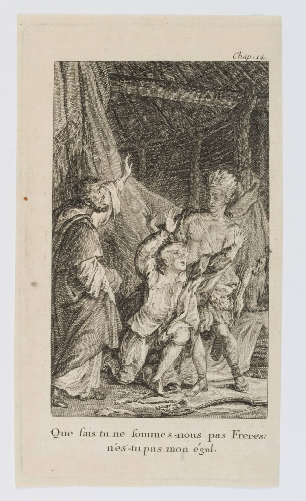 - Beschreibung: Illustration aus Jean Francois Marmontels ‘Les Incas : Ou la destruction de l’empire du Pérou’ 1777. Unter der Darstellung beschriftet mit: “Que fais tu ne sommes-nous pas Freres: n’es-tu pas mon égal.”.