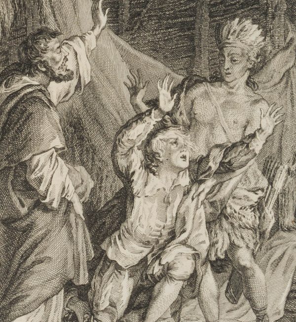 Jean-Baptiste-Blaise Simonet (18th century) after Jean Michel Moreau (1741 Paris – 1814 ibid.), Book illustration for the Indian novel “Les Incas” with an attack by an Indian on two Westerners, 1770, Etching