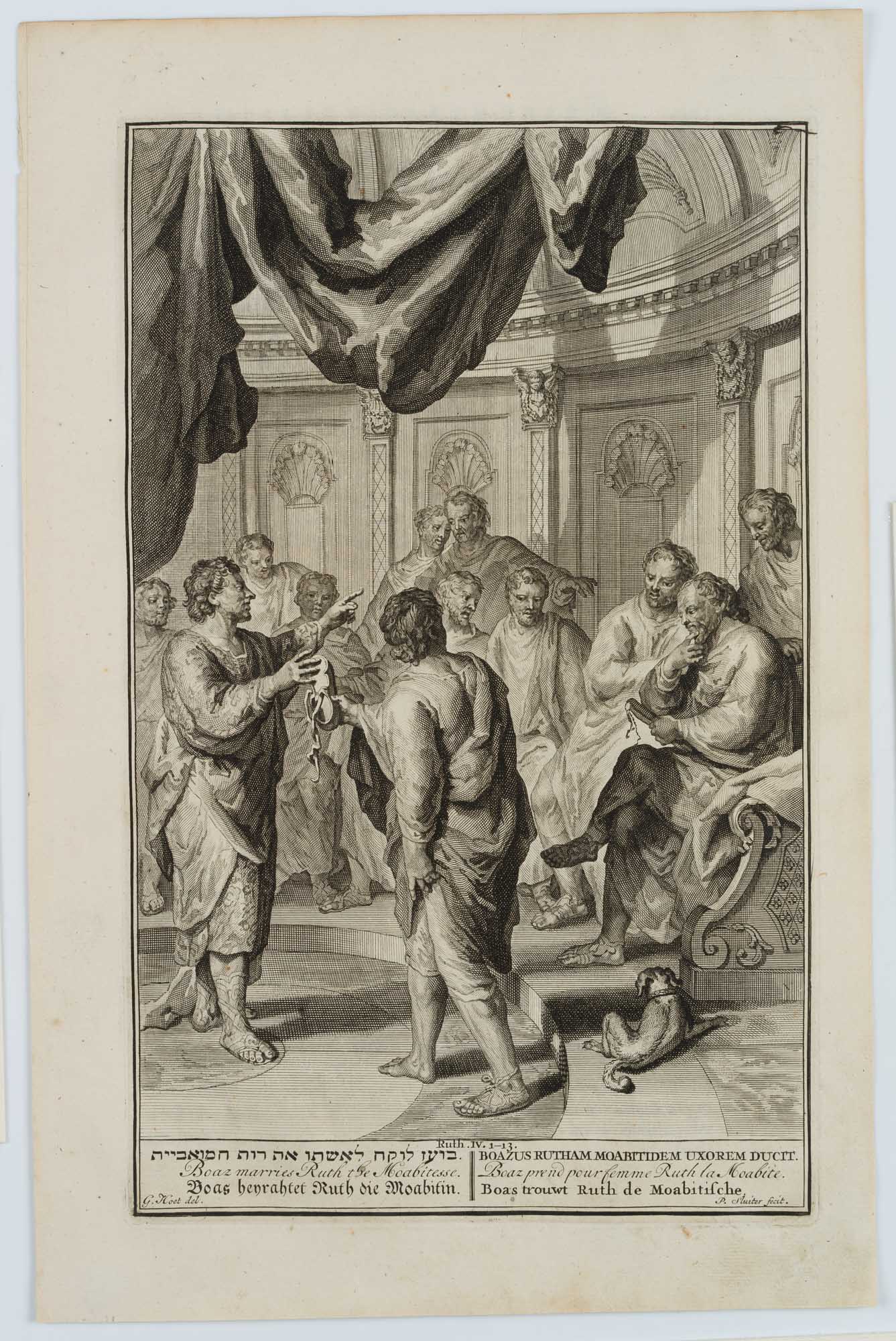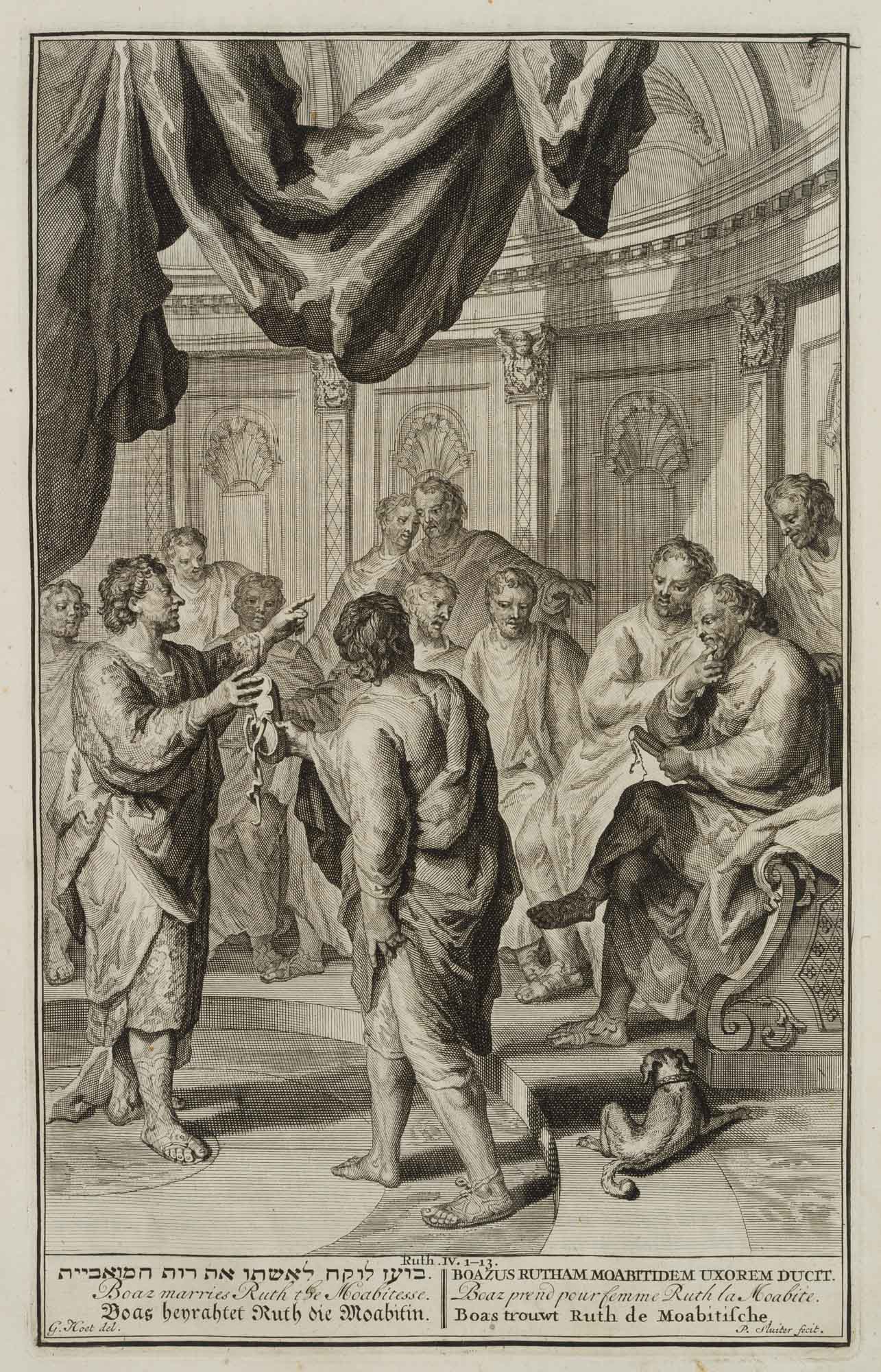 Pieter Sluiter (1675 Amsterdam – nach 1713 ebd.) nach Gerard Hoet (1648 Zaltbommel – 1733 Den Haag), Boaz einen Tausch abschließend, 1700, Kupferstich
