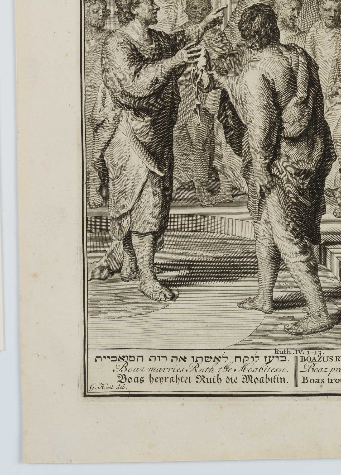 - Beschreibung: Boaz tauscht Land und kann damit auch Ruth zur Frau nehmen. Wer zu jener Zeit in Israel sein Besitzrecht einem anderen übertrug oder einen Tauschhandel abschloss, zog als Zeichen dafür seinen Schuh aus und gab ihn dem anderen. Am unteren Rand mit Verweis auf den Bibeltext: “Ruth IV. 1-13” und den Titel in Hebräisch, Englisch, Deutsch, Latein, Französisch und Niederländisch, darunter signiert. Auf der Innenseite des Blattbogens der Bibeltext, der rückseitig mit einer Kupfer-Vignette abschließt. Blattbogen aus: ‘Tafereelen der heilige geschiedenissen van het oude en nieuwe testament en der andere boeken gevoegt by de heilige schrift’.