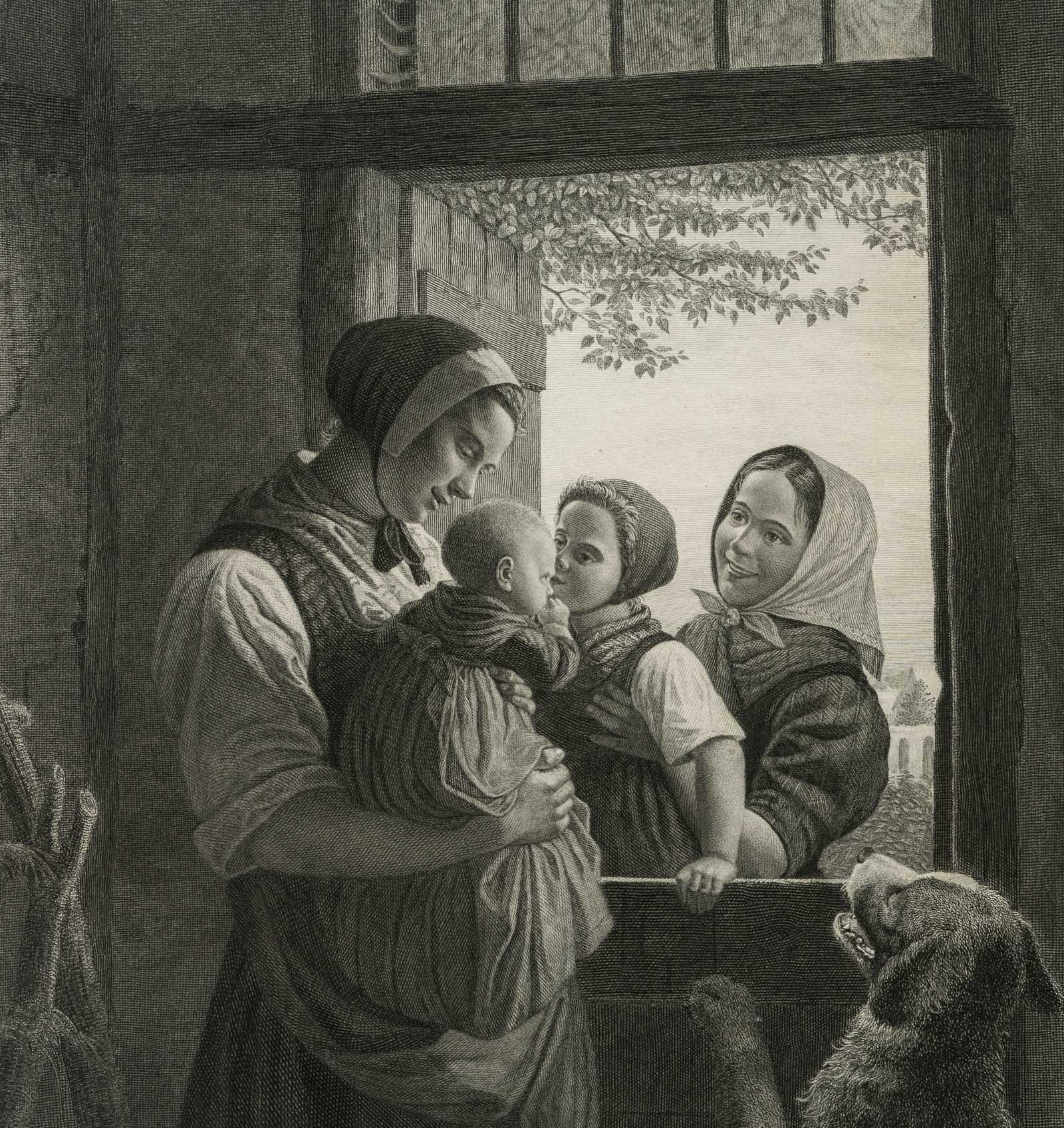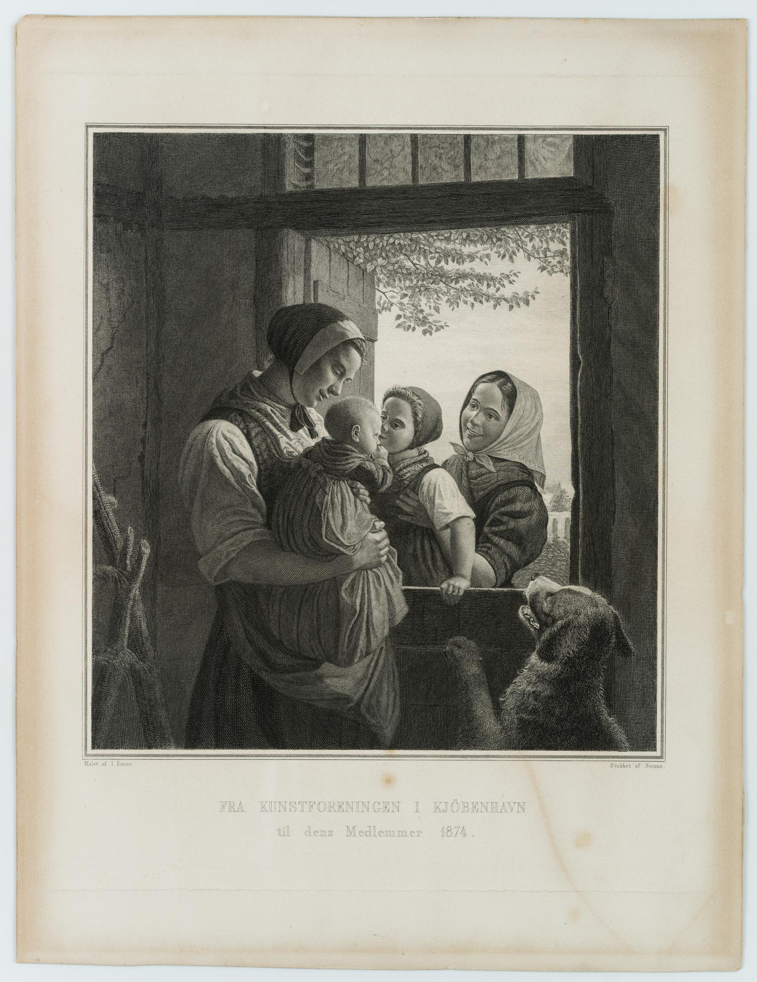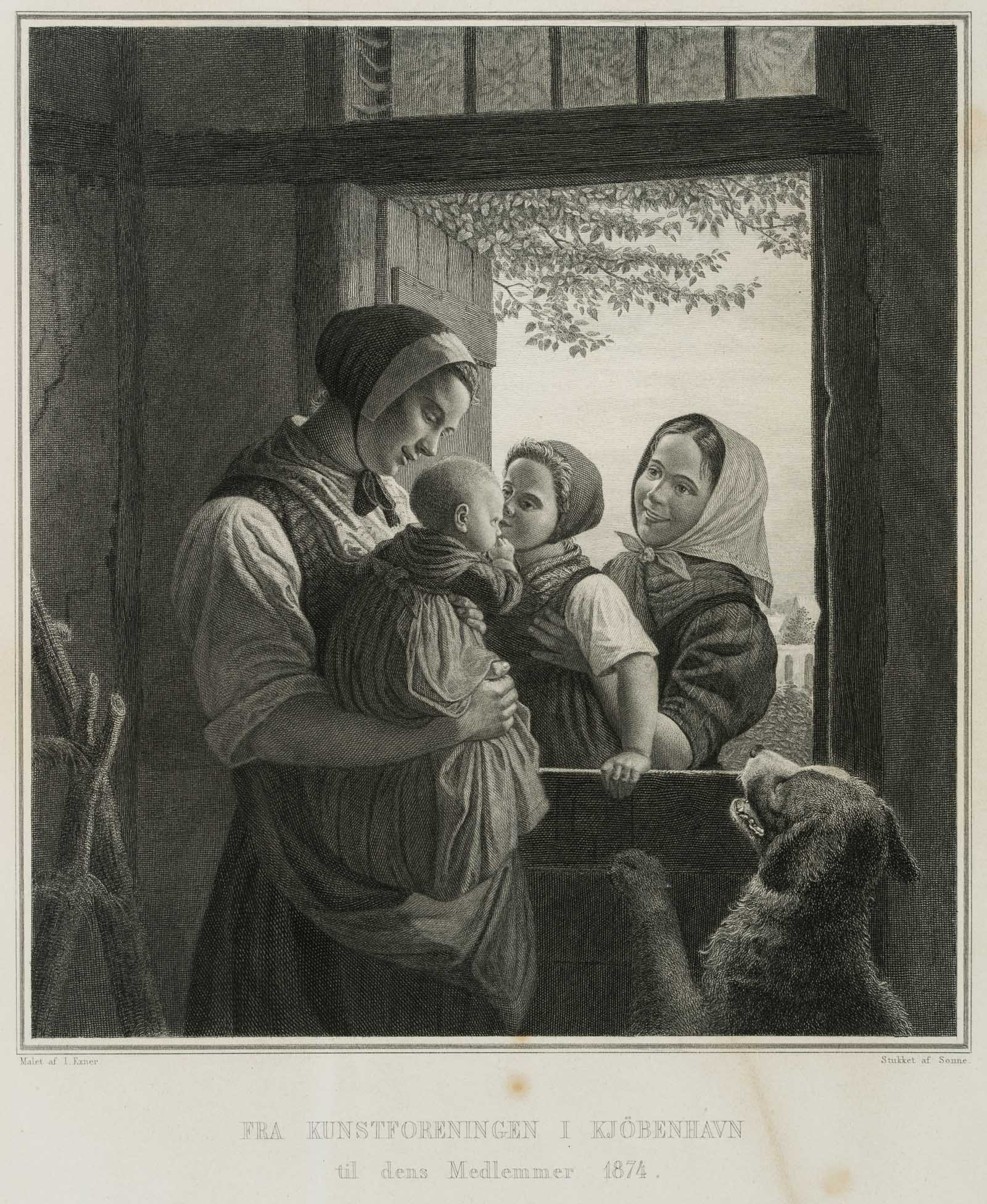 - Description: Charming genre painting with mother, children and a dog jumping up. Signed below the image within the printing plate “Malet af I. Exner / Stukket af Sonne.”, inscribed below in the centre with Fra Kunstforeningen I Kjöbenhaven / til dens Medlemmer 1874.”. After the Danish genre painter Julius Exner; pupil of the painters Johann Ludwig Lund and Christoffer Wilhelm Eckersberg at the Royal Danish Art Academy; study trips to Germany and Switzerland, Italy and Sweden; professor at the Danish Art Academy.