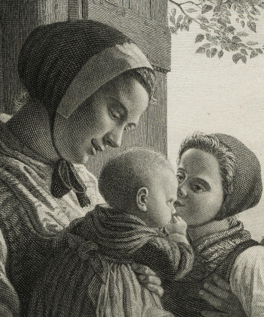 Carl Edvard Sonne (1804 Birkerød – 1878 Kopenhagen) nach Johann Julius Exner (1825 Kopenhagen – 1910 ebd.), Die kleinen Nachbarn, Genrebild mit Kindern, 1872, Kupferstich