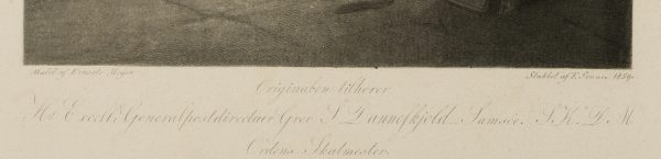 - Bezeichnung: Unterhalb der Darstellung, innerhalb der Druckplatte, signiert und datiert “Malel af Ernesto Meyer / Stukket af E Sonne. 1859., darunter betitelt und bezeichnet “Originalen tilhörer / H. Excell: Generalpostdirecteur Grev …”