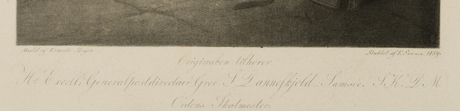 - Inscription: Signed and dated below the image, within the printing plate, “Malel af Ernesto Meyer / Stukket af E Sonne. 1859., titled and inscribed below “Originalen tilhörer / H. Excell: Generalpostdirecteur Grev …”