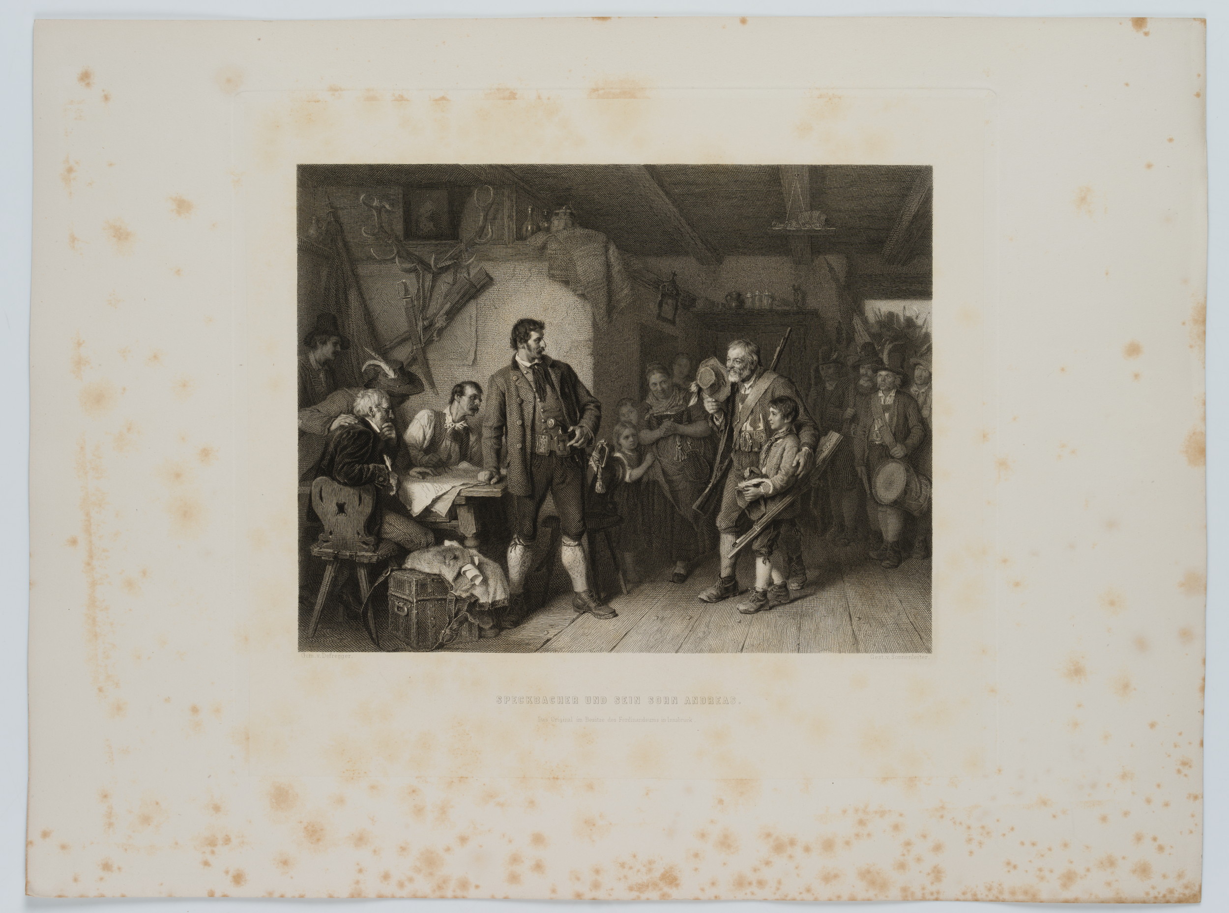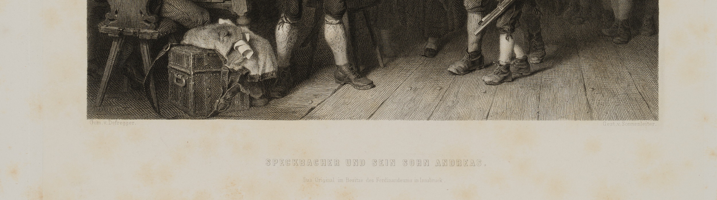 - Bezeichnung: Unten mittig im Druck signiert: “Gem. v. Defregger | Gest. v. Sonnenleiter”. Unten mittig im Druck bezeichnet: “Speckbacher und sein Sohn Andreas”.