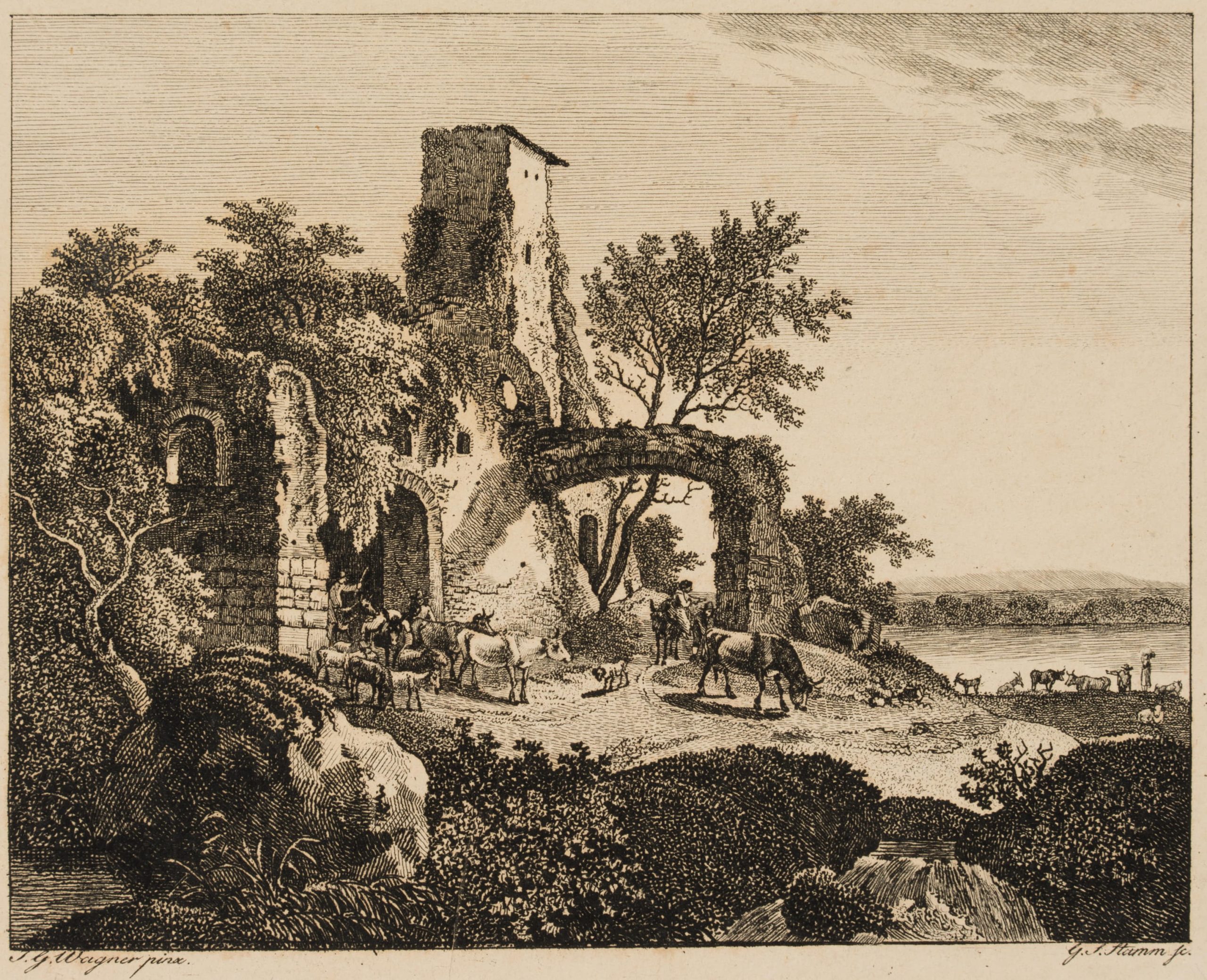 - Beschreibung: Wahrscheinlich späterer Abdruck der Graphik Stamms; Darstellung einer idyllischen Landschaft mit Hirten und ihren Tieren an einer Turmruine.