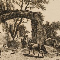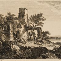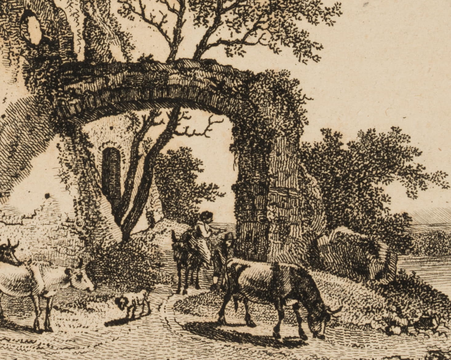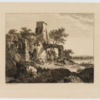 - Description: Probably a later impression of Stam’s print; depiction of an idyllic landscape with shepherds and their animals at a ruined tower.