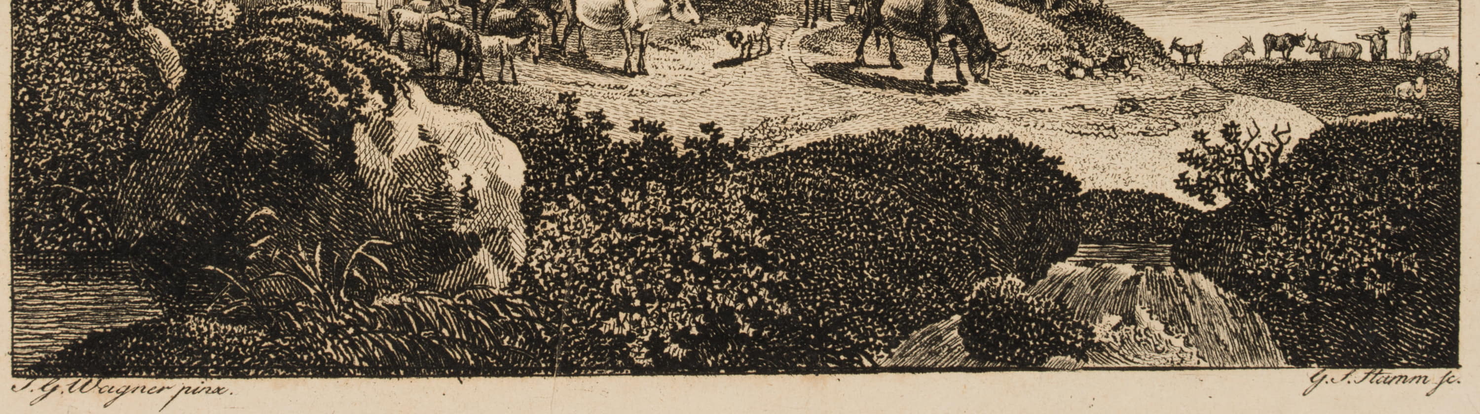 - Bezeichnung: Unten im Druck signiert: “J.G.Wagner pinx. / G.S.Stamm fc.”. Unterhalb der Darstellung in der Druckplatte signiert “J.G.Wagner pinx.” und “G.S.Stamm fc.”