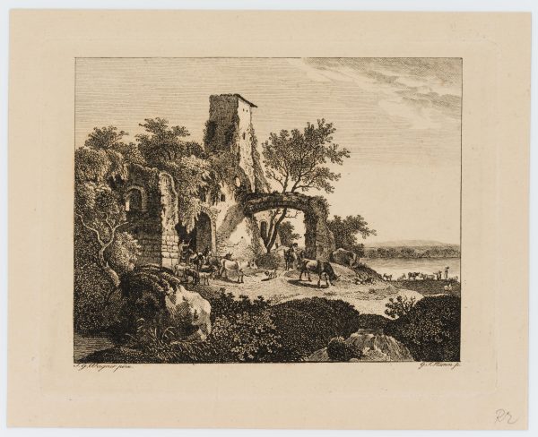 Johann Gottlob Samuel Stamm (1767 Meissen – 1814 Dresden) after Johann Georg Wagner (1744 Meissen – 1767 ibid.), Cattle herders at romantic ruin, c. 1800, Etching
