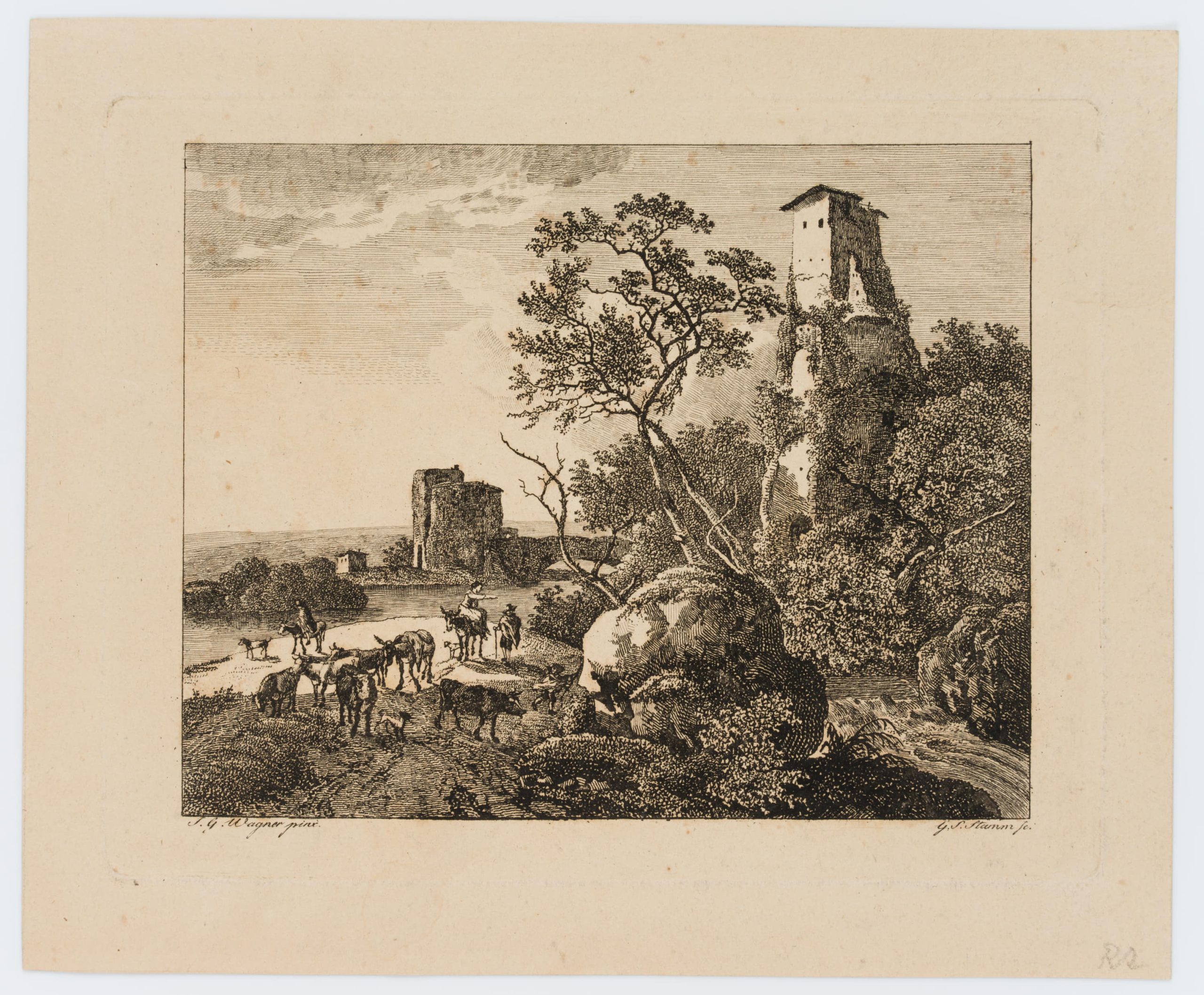 - Keywords: Herd, Cattle, Coast, Ruin, Tower, Shepherd, Landscape, Idyll, Arcadia, Print, Germany, 18th century, Romanticism, Landscape, Germany,