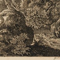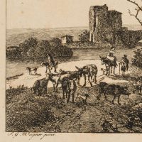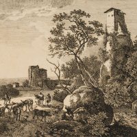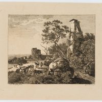 - Description: Probably a later impression of Stam’s print; depiction of an idyllic landscape with shepherds and herd and a ruined tower on a coast.