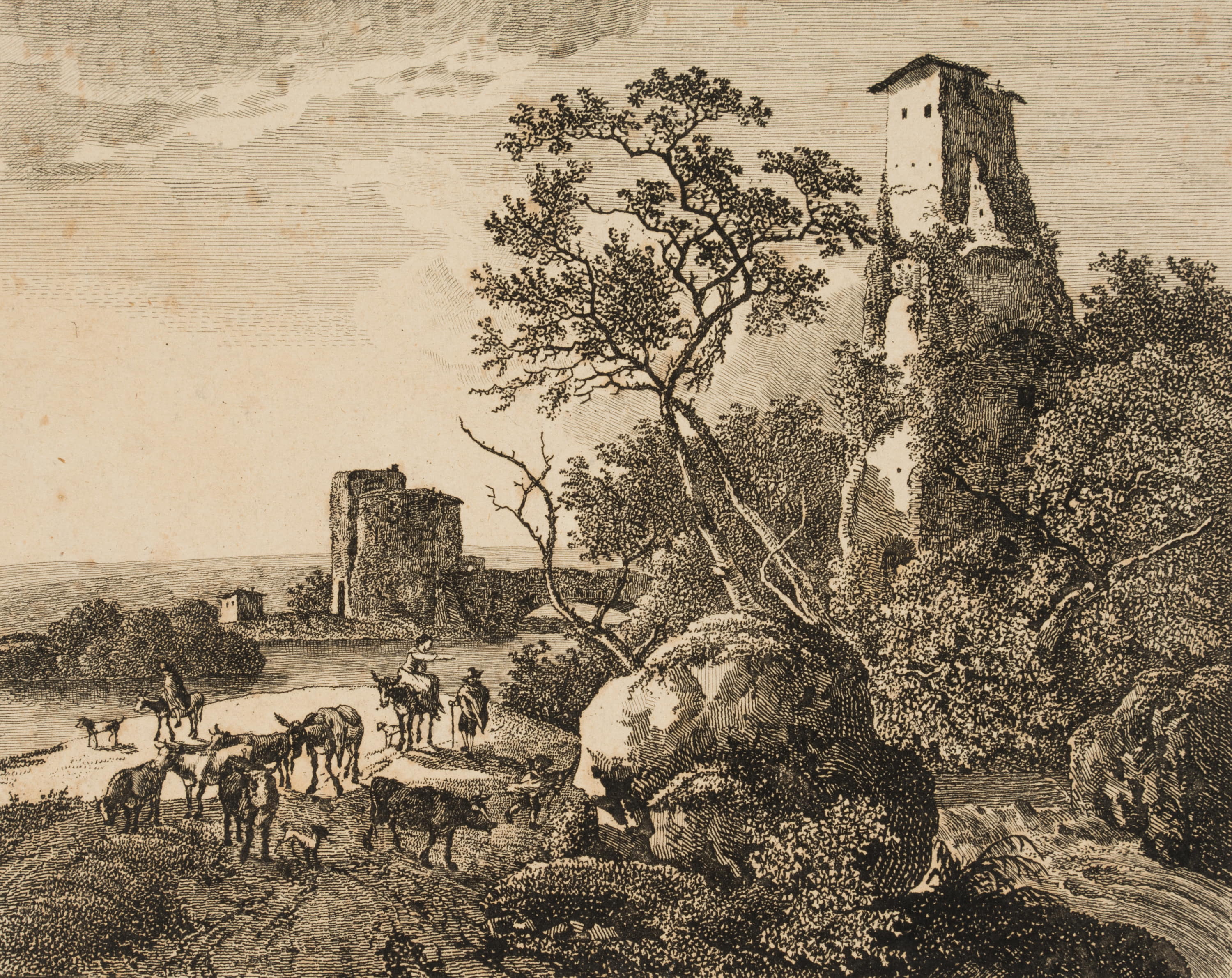 - Keywords: Herd, Cattle, Coast, Ruin, Tower, Shepherd, Landscape, Idyll, Arcadia, Print, Germany, 18th century, Romanticism, Landscape, Germany,