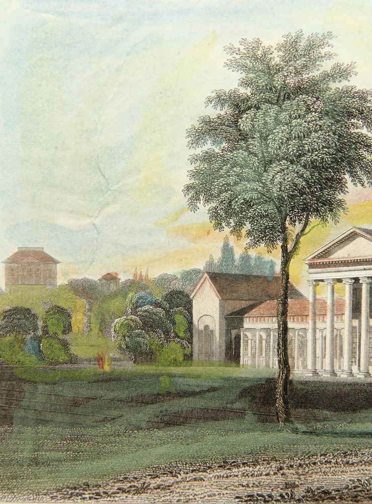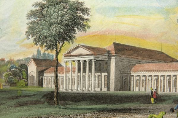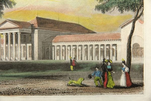 - Description: After an original by William Tombleson (* about 1795 England). The sheet probably originates from the series Views of the Rhine from about 1840. Beautiful view of the “Altes Kurhaus” in Wiesbaden with classicistic portico and colonnades, which was built in 1810 by Christian Zais and demolished in 1904. In the foreground are strolling ladies and gentlemen and a child playing with a dog.