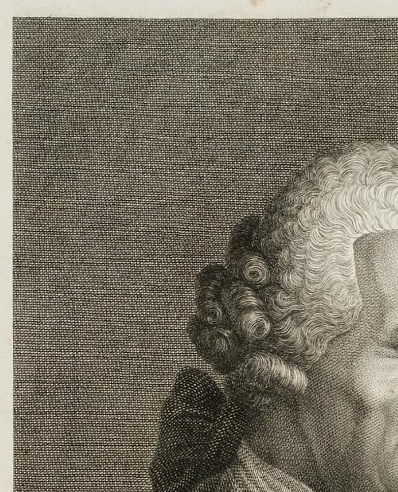 Büstenporträt im Halbprofil nach dem Porträt Graffs von 1772. Der Stich gibt die Gesichtszüge genau und fein nuanciert wieder und belebt sie durch gelungene Licht-/Schattenführung.