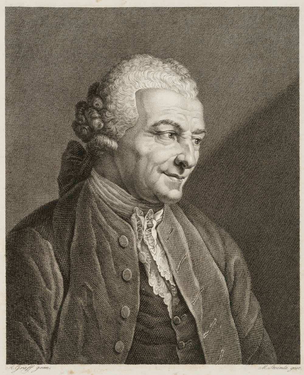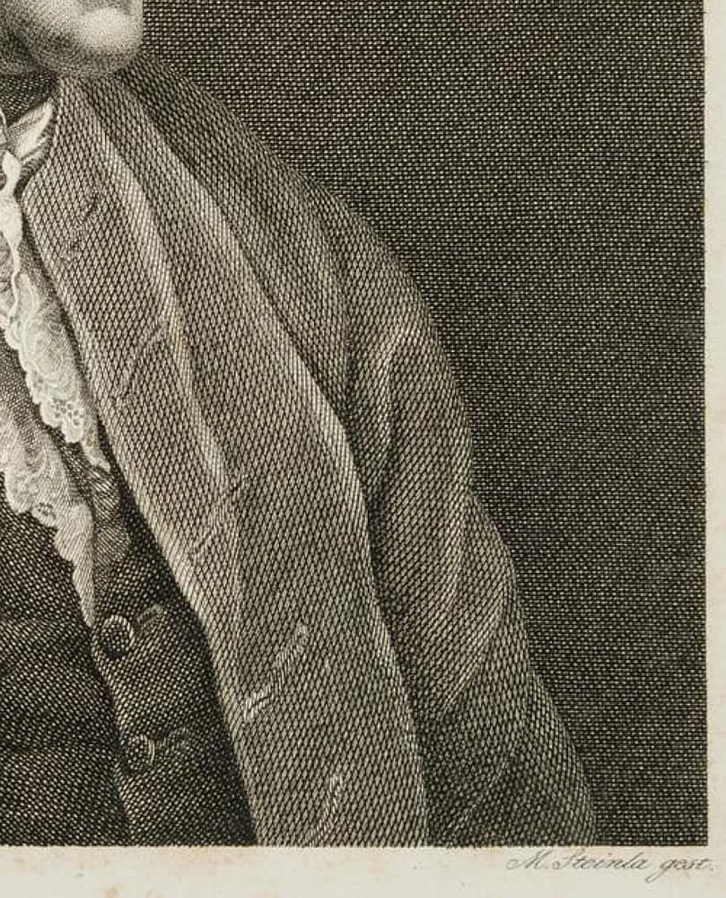 • Beschreibung: Büstenporträt im Halbprofil nach dem Porträt Graffs von 1772. Der Stich gibt die Gesichtszüge genau und fein nuanciert wieder und belebt sie durch gelungene Licht-/Schattenführung.