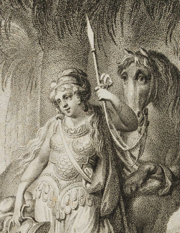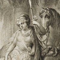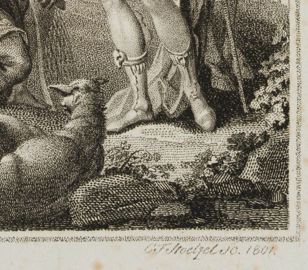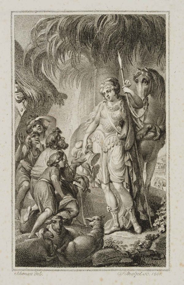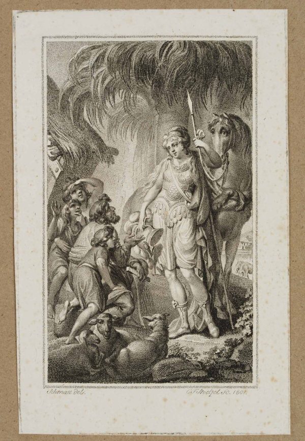 - Beschreibung: Illustration zu Torquato Tasso: “Befreytes Jerusalem”, vierzehnter Gesang. Die Darstellung zeigt eine Hirtenfamilie, die vor einer Frau im Kriegergewand kniet. Unter der Darstellung signiert und datiert, links: “Schenau del.”, rechts: “C.F. Stoelzel sc. 1801”.