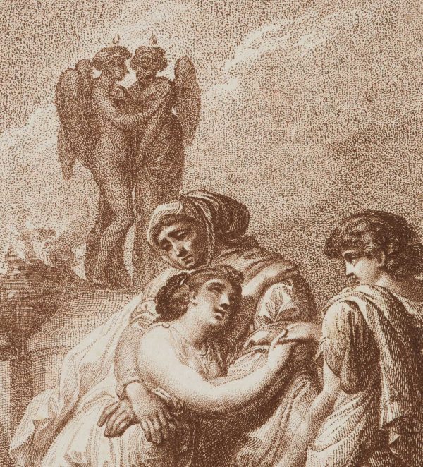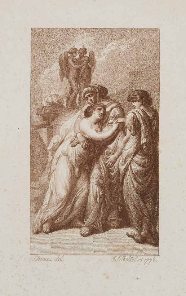 - Beschreibung: Ein junges Mädchen liegt einer älteren Frau in den Armen. Im Hintergrund ist ein dampfender Weihrauchkessel zu sehen und eine Skulptur, die zwei sich umarmende Amoretten darstellt. Unter der Darstellung signiert und datiert, links: “Schenau del.”, rechts: “C.F. Stoelzel sc. 1794”.