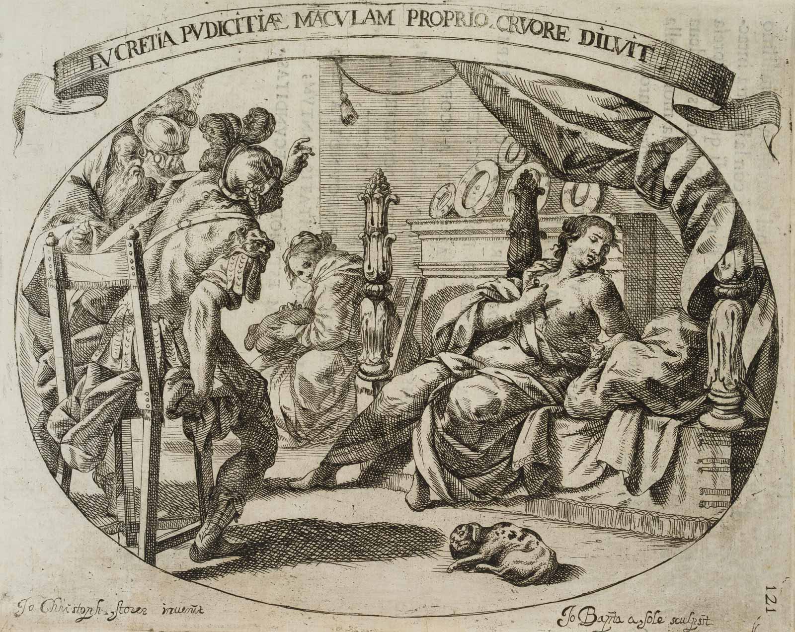 - Beschreibung: Lucretia in Gegenwart ihrer Verwandten sich den Tod gebend, ein schönes und seltenes Blatt, welches in Dr. Petzold’s Catalog (Vienne, Artaria 1843 vorkommt). Es gehört zu einer Folge von mindestens 14 Blättern, an welchen auch Gio. Paolo Blanc Teil hat. Nach Fresco-und Plafondmalereien aus der Geschichte der Semiramis und anderen berühmten Heldinnen in reichen Kompositionen. Nach Johann Christoph Storer (* um 1620 in Konstanz; † 1671), deutscher Maler, Radierer und Zeichner für den Kupferstich des 17. Jahrhunderts. Er wirkte in der Blütezeit barocker Sakralkunst nach dem Ende des Dreißigjährigen Krieges.Über der Darstellung betitelt, unten nummeriert “121” und signiert: “Storer invenit / Io Bapta a Sole sculpsit”; verso typographischer Druck auf Italienisch und Latein; aus: ´Racconto delle sontuose esequie fatte alla Serenissima Isabella Reina di Spagna..´, Mailand bei Dionisio Gariboldi, o.D. (1645).
