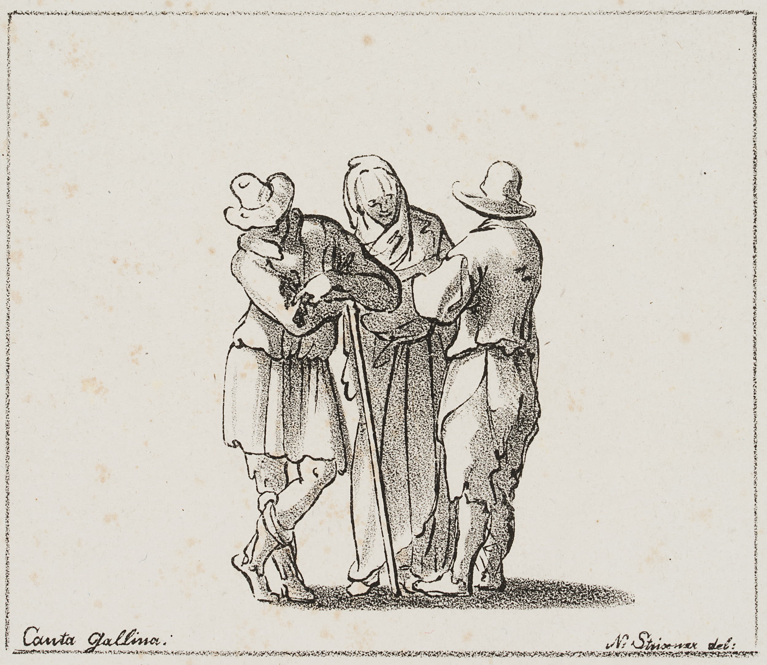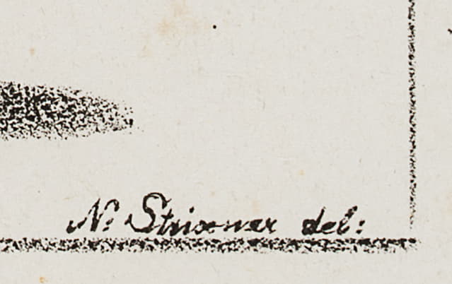 - Inscription: Signed in the stone below the depiction: “Canta Gallina: | N: Strixner del:”