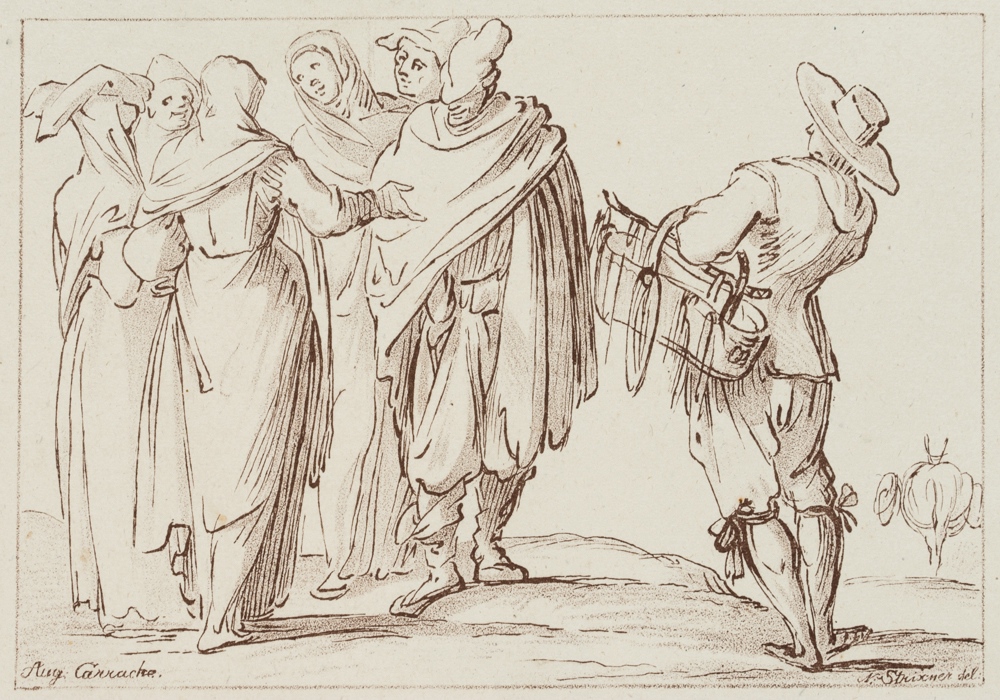 Johann Nepomuk Franz Xaver Strixner (1782 Altötting – 1855 München) nach Agostino Carracci (1557 Bologna – 1602 Parma), Figurengruppe mit Edelfrauen und Krämer, 19. Jahrhundert, Lithographie